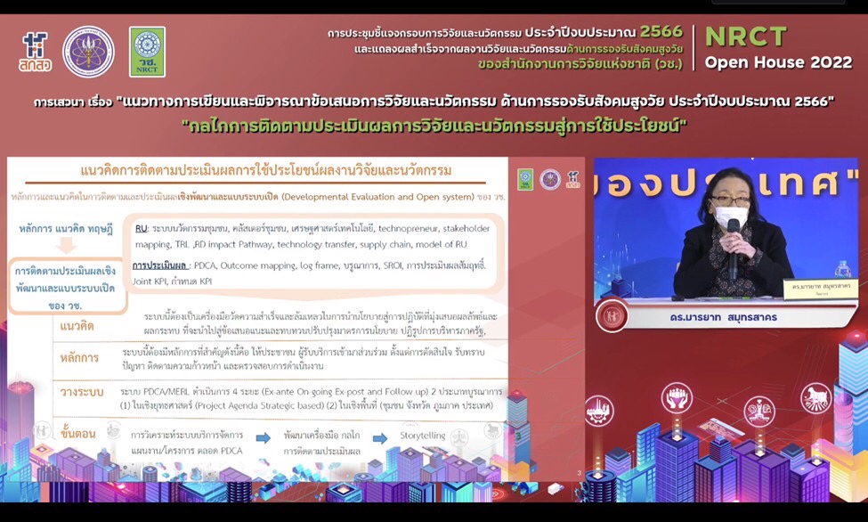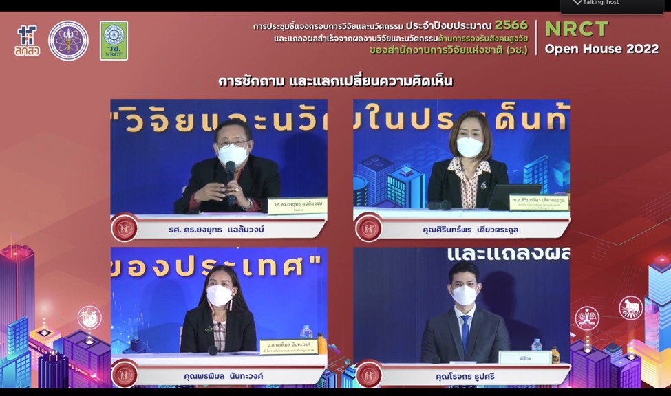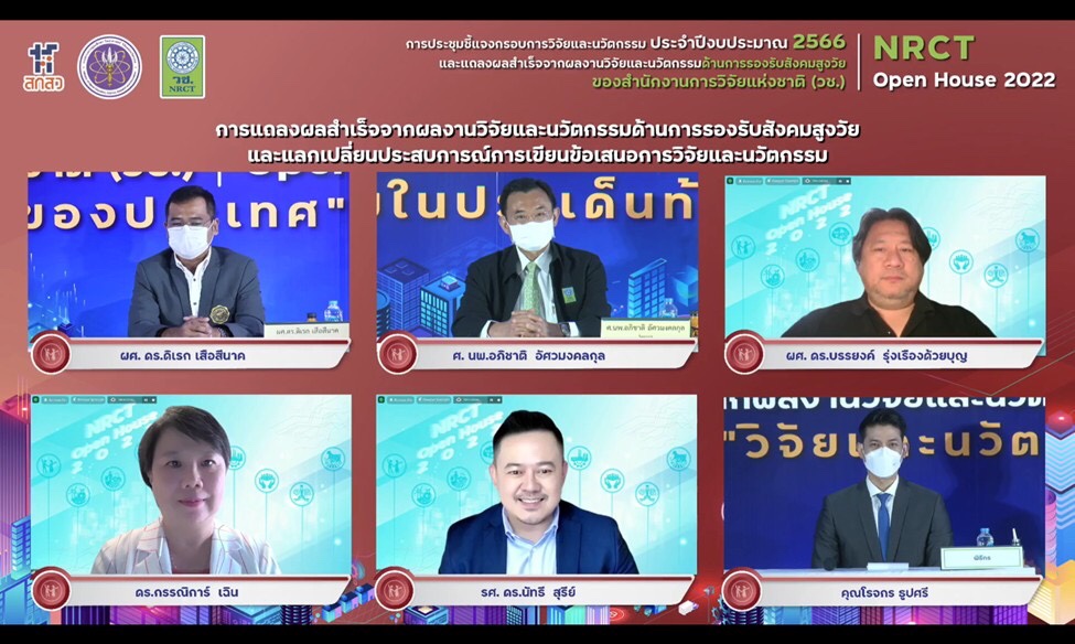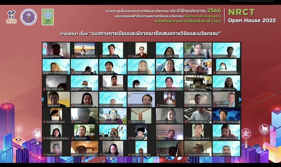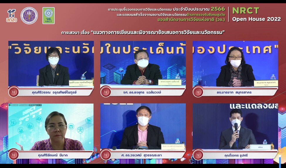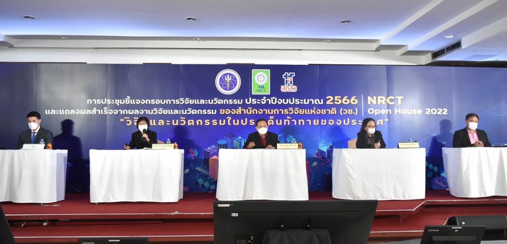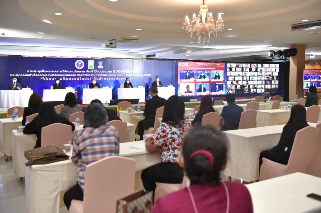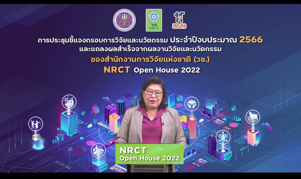วันที่ 12 มิถุนายน 2565 สำนักงานการวิจัยแห่งชาติ (วช.) กระทรวงการอุดมศึกษา วิทยาศาสตร์ วิจัยและนวัตกรรม จัดการประชุมชี้แจงกรอบการวิจัยและนวัตกรรม ประจำปีงบประมาณ 2566 และแถลงผลสำเร็จจากการวิจัยและนวัตกรรม NRCT Open House 2022 “วิจัยและนวัตกรรมในประเด็นท้าทายของประเทศ” ระหว่างวันที่ 12 – 19 มิถุนายน 2565 ณ ห้องประชุมจอมพลสฤษดิ์ ธนะรัชต์ สำนักงานการวิจัยแห่งชาติ และออนไลน์ผ่านวีดีทัศน์ทางไกล (VDO Conference) ด้วยระบบ Zoom และการถ่ายทอดสด (Live Steaming) ผ่าน Facebook ของสำนักงานการวิจัยแห่งชาติ เพื่อชี้แจงกรอบการวิจัยและนวัตกรรม ประจำปีงบประมาณ 2566 ของ วช. และแนวทางการเขียนและพิจารณาข้อเสนอการวิจัยและนวัตกรรม รวมทั้งแถลงผลสำเร็จจากการวิจัยและนวัตกรรม เพื่อเป็นเวทีแลกเปลี่ยนประสบการณ์การเขียนข้อเสนอการวิจัยและนวัตกรรมและการยื่นขอทุน วช. โดยมี ดร.วิภารัตน์ ดีอ่อง ผู้อำนวยการสำนักงานการวิจัยแห่งชาติ เป็นประธานเปิดการประชุมฯ
