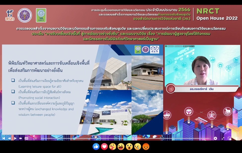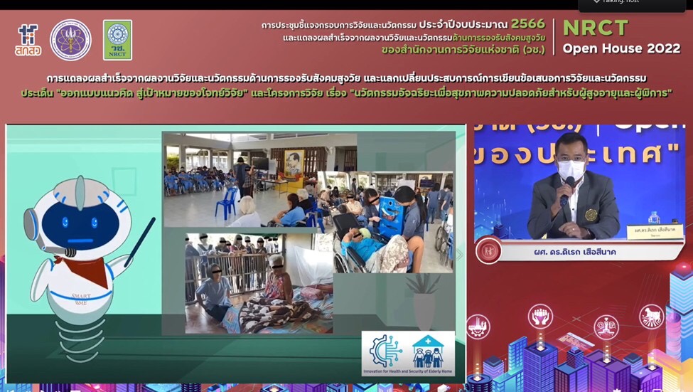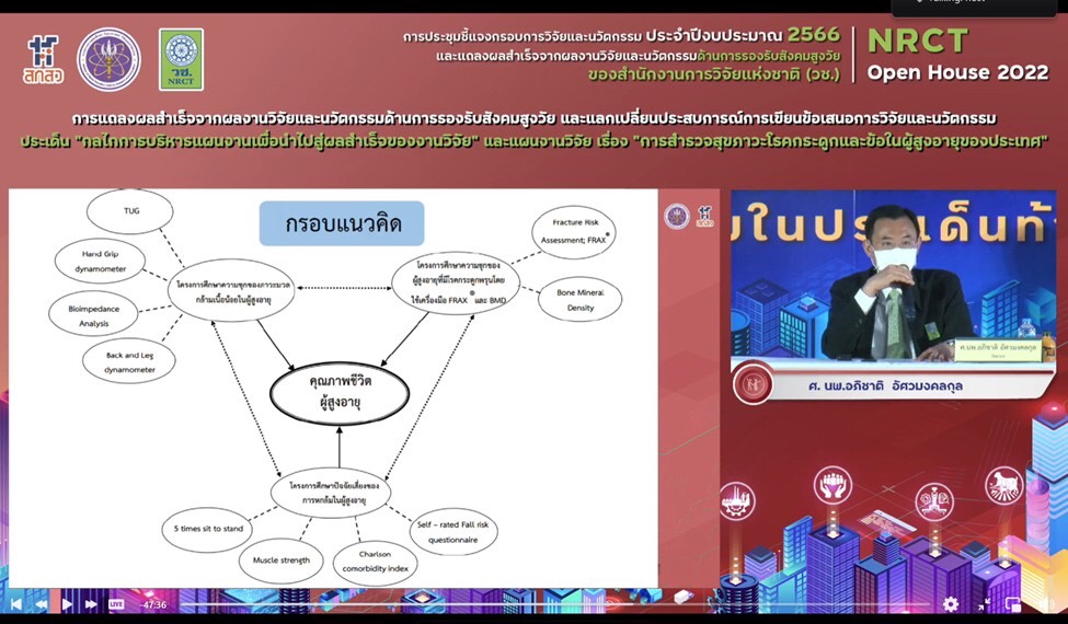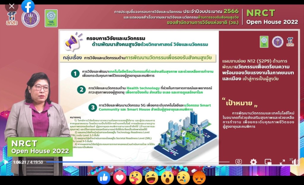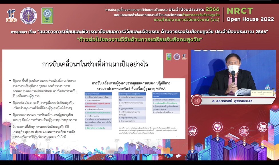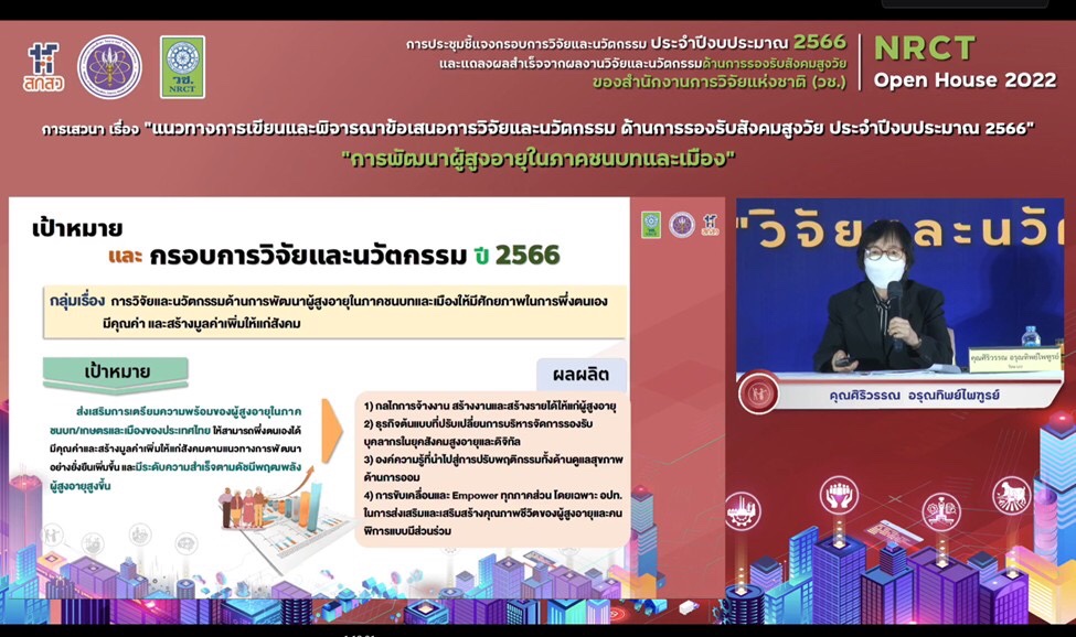 ดร.วิภารัตน์ ดีอ่อง ผู้อำนวยการสำนักงานการวิจัยแห่งชาติ กล่าวว่า วช. ภายใต้กระทรวงการอุดมศึกษา วิทยาศาสตร์ วิจัยและนวัตกรรม เป็นหน่วยงานหลักในการบริหารทุนวิจัยและนวัตกรรมของประเทศ โดยมุ่งเน้นผลสำเร็จจากการวิจัยที่สามารถนำไปใช้ประโยชน์ในมิติต่างๆ ทั้งมิติด้านวิชาการ ด้านเศรษฐกิจ ด้านสังคมและชุมชน และด้านนโยบาย เพื่อเป็นกลไกในการพัฒนาและแก้ปัญหาเร่งด่วนสำคัญของประเทศ บรรลุเป้าหมายการพัฒนาที่ยั่งยืน ทั้งยังมุ่งเน้นการตอบผลสัมฤทธิ์ที่สำคัญของแผนด้านวิทยาศาสตร์ วิจัยและนวัตกรรมของประเทศ พ.ศ. 2566-2570 โดยในปี 2566 วช. ได้รับมอบหมายจากสำนักงานคณะกรรมการส่งเสริมวิทยาศาสตร์ วิจัยและนวัตกรรม (สกสว.) ให้ดำเนินการบริหารทุนวิจัยและนวัตกรรม ภายใต้ยุทธศาสตร์ที่สำคัญ 2 ยุทธศาสตร์ ได้แก่ ยุทธศาสตร์ที่ 2 การยกระดับสังคมและสิ่งแวดล้อม ให้มีการพัฒนาอย่างยั่งยืน สามารถแก้ไขปัญหาท้าทาย และปรับตัวได้ทันต่อพลวัตการเปลี่ยนแปลงของโลก โดยใช้วิทยาศาสตร์ การวิจัยและนวัตกรรม และยุทธศาสตร์ที่ 4 การพัฒนากำลังคนและสถาบันด้านวิทยาศาสตร์ วิจัยและนวัตกรรมให้เป็นฐานการขับเคลื่อนการพัฒนาเศรษฐกิจและสังคมของประเทศแบบก้าวกระโดดและอย่างยั่งยืน โดยใช้วิทยาศาสตร์ การวิจัยและนวัตกรรม ซึ่ง วช. มุ่งมั่นการสร้างนักวิจัยที่สามารถสร้างองค์ความรู้และผลิตผลงานที่มีคุณภาพสูงในระดับสากล ตลอดจนสนับสนุนให้เกิดการขยายเครือข่ายการวิจัยที่มีประสิทธิภาพสูงต่อไป โดยภายในการประชุมดังกล่าว มีการชี้แจงกรอบการวิจัยและนวัตกรรมด้านการรองรับสังคมสูงวัย ประจำปี 2566 ซึ่ง วช. ได้ตั้งเป้าหมายที่จะมุ่งพัฒนาผู้สูงวัยให้มีศักยภาพในการพึ่งพาตนเอง การเพิ่มมูลค่าทางสังคม ทั้งในมิติเมืองและชนบท และด้านเกษตร สิ่งแวดล้อม รวมทั้งการยกระดับคุณภาพชีวิตของผู้สูงวัย การอยู่ร่วมกันของคนทุกช่วงวัย และการนำเทคโนโลยีและนวัตกรรมมาช่วยสนับสนุนการดำรงชีวิตของผู้สูงอายุ