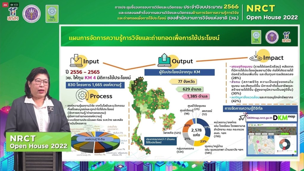 ดร.วิภารัตน์ ดีอ่อง ผู้อำนวยการสำนักงานการวิจัยแห่งชาติ กล่าวว่า วช. ภายใต้กระทรวง อว. ได้จัดการประชุมชี้แจงกรอบการวิจัยและนวัตกรรม NRCT Open House 2022 จัดขึ้นเป็นวันที่สี่แล้ว วันนี้เป็นการประชุมด้านการจัดการความรู้การวิจัยและถ่ายทอดเพื่อการใช้ประโยชน์ (KM) ประจำปีงบประมาณ 2566 และการแถลงผลสำเร็จจากผลงานวิจัยและนวัตกรรมด้านการจัดการความรู้การวิจัยและถ่ายทอดเพื่อการใช้ประโยชน์ ซึ่ง วช. มุ่งมั่นส่งเสริมเส้นทางการขับเคลื่อนการใช้ประโยชน์ ตั้งแต่ปัจจัยการนำเข้า ผลผลิต ผลลัพธ์ และผลกระทบ การใช้ประโยชน์จาก KM 4 มิติ ได้แก่ เชิงความั่นคง เชิงชุมชนสังคม การพัฒนาชุมชนพึ่งพาตนเองตามแนวทางพระราชดำริ และเชิงนโยบายสาธารณะ รวมไปถึงการสร้างนักวิจัยอาชีพที่สามารถสร้างองค์ความรู้และผลิตผลงานที่มีคุณภาพสูงในระดับสากล รวมถึง ตลอดจนสนับสนุนให้เกิดการขยายเครือข่ายวิจัยที่มีประสิทธิภาพสูงต่อไป