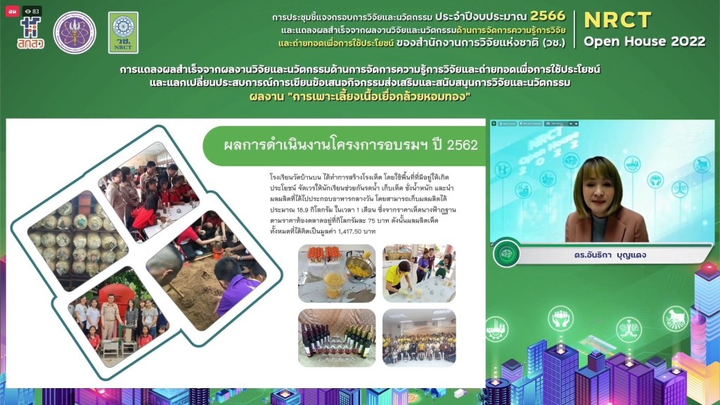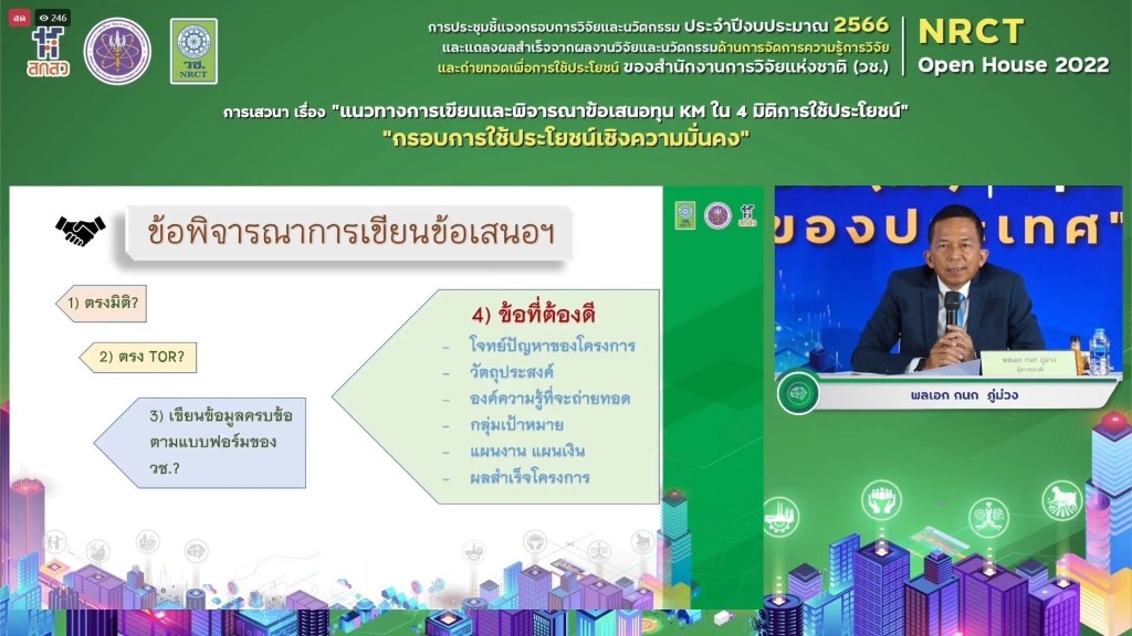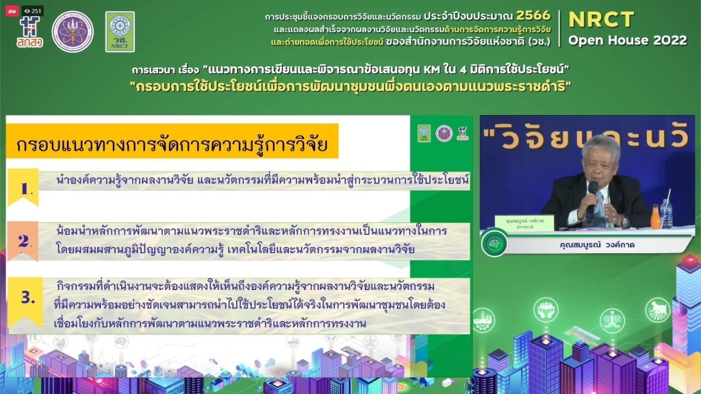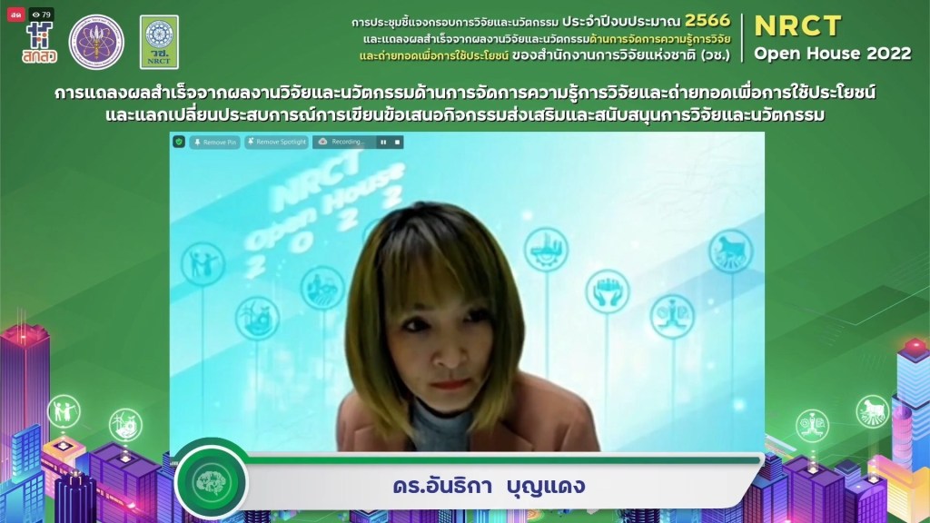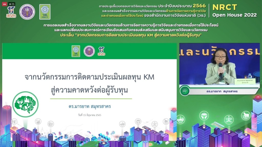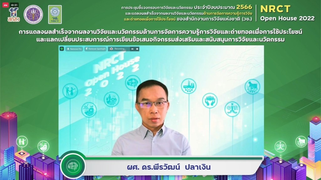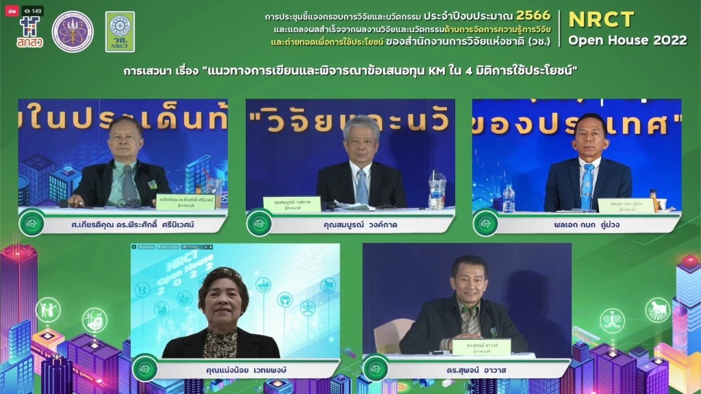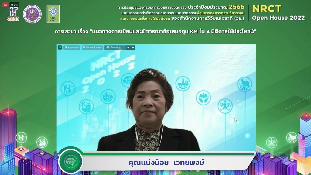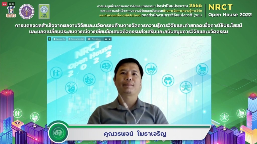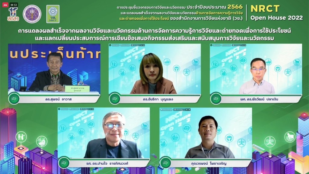 วันที่ 15 มิถุนายน 2565 สำนักงานการวิจัยแห่งชาติ (วช.) กระทรวงการอุดมศึกษา วิทยาศาสตร์ วิจัยและนวัตกรรม จัดการประชุมชี้แจงกรอบการวิจัยและนวัตกรรมด้านการจัดการความรู้การวิจัยและถ่ายทอดเพื่อการใช้ประโยชน์ (KM) ประจำปีงบประมาณ 2566 และการแถลงผลสำเร็จจากผลงานวิจัยและนวัตกรรมด้านการจัดการความรู้การวิจัยและถ่ายทอดเพื่อการใช้ประโยชน์ NRCT Open House 2022 “วิจัยและนวัตกรรมในประเด็นท้าทายของประเทศ” เพื่อชี้แจงกรอบการวิจัยและนวัตกรรม ประจำปีงบประมาณ 2566 ของ วช. และแนวทางการเขียนและพิจารณาข้อเสนอการวิจัยและนวัตกรรม รวมทั้งแถลงผลสำเร็จจากการวิจัยและนวัตกรรม เพื่อเป็นเวทีแลกเปลี่ยนประสบการณ์การเขียนข้อเสนอการวิจัยและนวัตกรรมและการยื่นขอทุน วช. ด้านการจัดการความรู้การวิจัยและถ่ายทอดเพื่อการใช้ประโยชน์ โดย ดร.วิภารัตน์ ดีอ่อง ผู้อำนวยการสำนักงานการวิจัยแห่งชาติ เป็นประธานเปิดการประชุมฯ