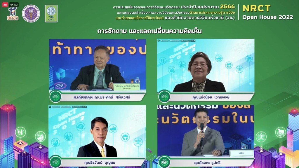 นอกจากนี้ยังมีการเสวนาเรื่อง “แนวทางการเขียนและพิจารณาข้อเสนอทุน KM ใน 4 มิติการใช้ประโยชน์” ผู้ร่วมเสวนาประกอบด้วย ศาสตราจารย์เกียรติคุณ ดร.พีระศักดิ์ ศรีนิเวศน์, นายสมบูรณ์ วงค์กาด, พลเอก กนก ภู่ม่วง และนางแน่งน้อย เวทยพงษ์ โดยมี ดร.สุพจน์ อาวาส เป็นผู้ดำเนินรายการ การซักถามและแลกเปลี่ยนความคิดเห็น โดย ศาสตราจารย์เกียรติคุณ ดร.พีระศักดิ์ ศรีนิเวศน์, นางแน่งน้อย เวทยพงษ์ และนายธีรวัฒน์ บุญสม รวมถึงการนำเสนอวีดิทัศน์แนะนำการใช้งานระบบ NRIIS โดย นายเอนก บำรุงกิจ และปิดท้ายด้วยการแถลงผลสำเร็จจากผลงานวิจัยและนวัตกรรมด้านการจัดการความรู้การวิจัยและถ่ายทอดเพื่อการใช้ประโยชน์ และแลกเปลี่ยนประสบการณ์การเขียนข้อเสนอกิจกรรมส่งเสริมและสนับสนุนการวิจัยและนวัตกรรม โดย ดร.สุพจน์ อาวาส, ดร.มารยาท สมุทรสาคร, ดร.อันธิกา บุญแดง, ผู้ช่วยศาสตราจารย์ ดร.พีรวัฒน์ ปลาเงิน, รองศาสตราจารย์ ดร.ปานใจ ธารทัศนวงศ์ และนายวรพจน์ โพธาเจริญ โดยกิจกรรม NRCT Open House2022 : ด้านการจัดการความรู้การวิจัยและถ่ายทอดเพื่อการใช้ประโยชน์ การออกแบบความรู้ที่เป็นนวัตกรรมพร้อมใช้ เทคโนโลยีที่เหมาะสม เพื่อนำไปใช้ในกระบวนการวิจัยเพื่อแก้ไขปัญหาสำคัญ เสริมศักยภาพได้อย่างเป็นรูปธรรมผ่านการสร้างนวัตกรรมชุมชนที่เป็นผู้นำการเปลี่ยนแปลงในการรับและปรับใช้นวัตกรรมพร้อมใช้เทคโนโลยีที่เหมาะสมกับบริบท สามารถถ่ายทอดความรู้ไปสู่ผู้อื่นได้รวมทั้งสามารถเป็นแกนนำในการจัดกระบวนการเรียนรู้เพื่อหนุนให้ชุมชนมีพื้นที่และโอกาสเรียนรู้ได้อย่างต่อเนื่องและยั่งยืน