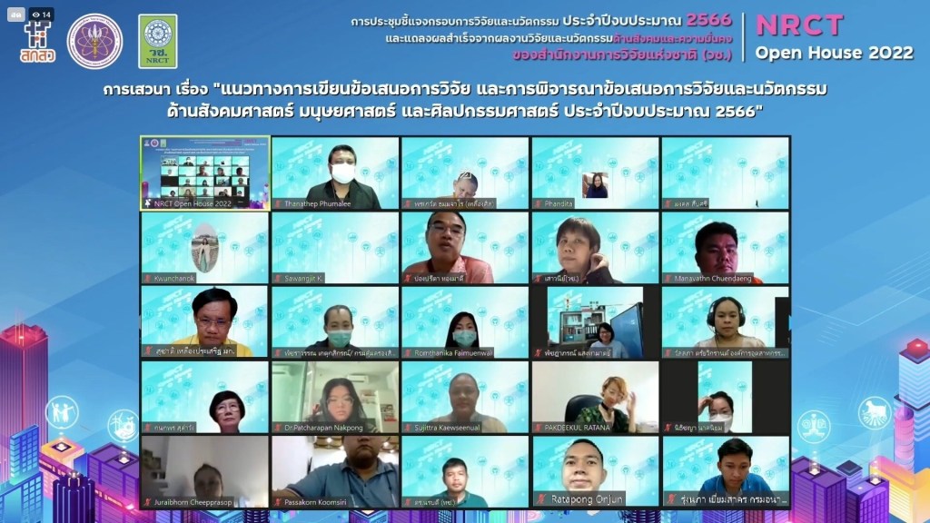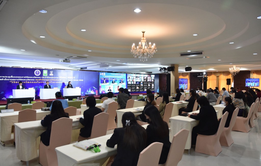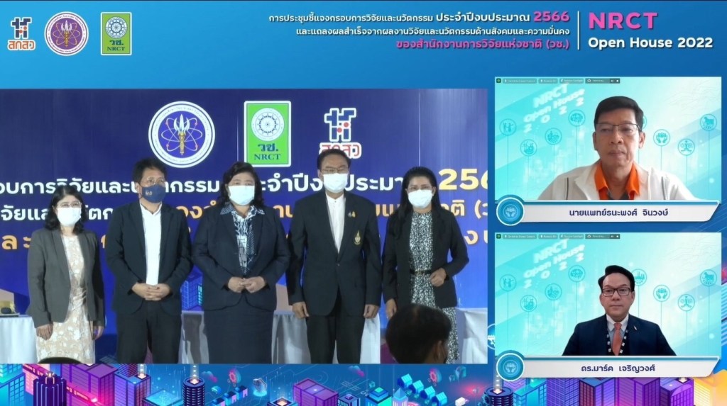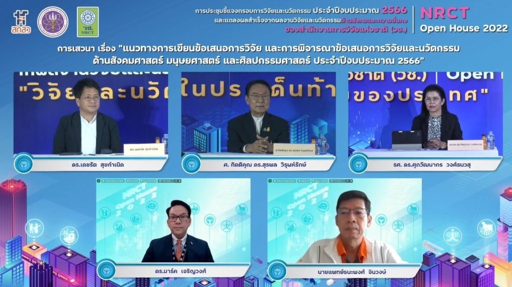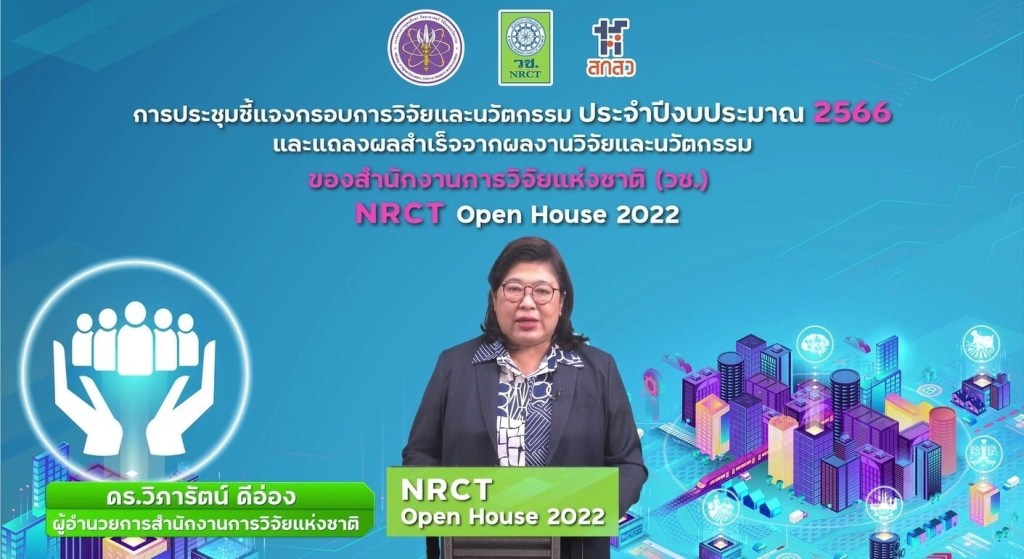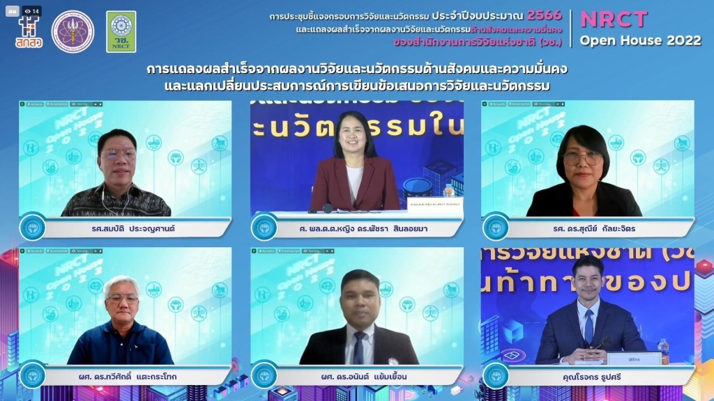 วันที่ 17 มิถุนายน 2565 สำนักงานการวิจัยแห่งชาติ (วช.) กระทรวงการอุดมศึกษา วิทยาศาสตร์ วิจัยและนวัตกรรม ได้จัดการประชุมชี้แจงกรอบการวิจัยและนวัตกรรมประจำปีงบประมาณ 2566 และแถลงผลสำเร็จจากการวิจัยและนวัตกรรมของสำนักงานการวิจัยแห่งชาติ (วช.) NRCT Open House 2022 “ด้านสังคมและความมั่นคง” ณ ห้องประชุมจอมพลสฤษดิ์ ธนะรัชต์ สำนักงานการวิจัยแห่งชาติ และออนไลน์ผ่านวีดิทัศน์ทางไกล (VDO Conference) ด้วยระบบ Zoom และการถ่ายทอดสด (Live Steaming) ผ่าน Facebook Live ของสำนักงานการวิจัยแห่งชาติ รวมทั้งแถลงผลสำเร็จจากการวิจัยและนวัตกรรมด้านสังคมและความมั่นคง รวมถึงเปิดโอกาสให้นักวิจัย และผู้ทรงคุณวุฒิของ วช. ได้แลกเปลี่ยนประสบการณ์การเขียนข้อเสนอการวิจัยและนวัตกรรมและการยื่นขอรับทุนของ วช. โดยมี ดร.วิภารัตน์ ดีอ่อง ผู้อำนวยการสำนักงานการวิจัยแห่งชาติ เป็นประธานเปิดการประชุม
