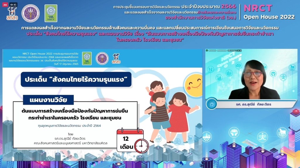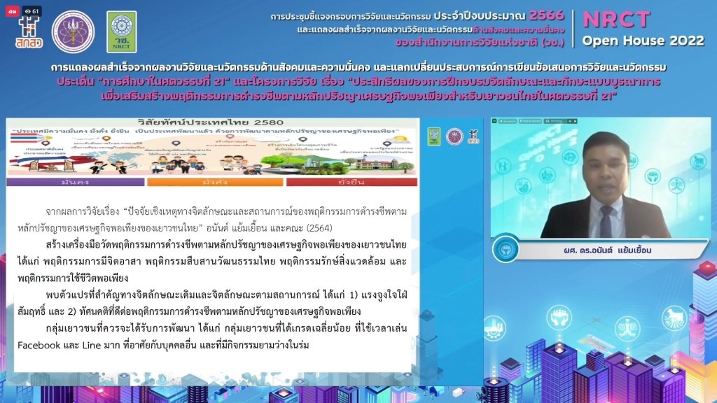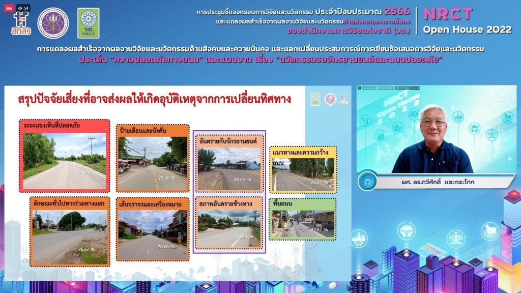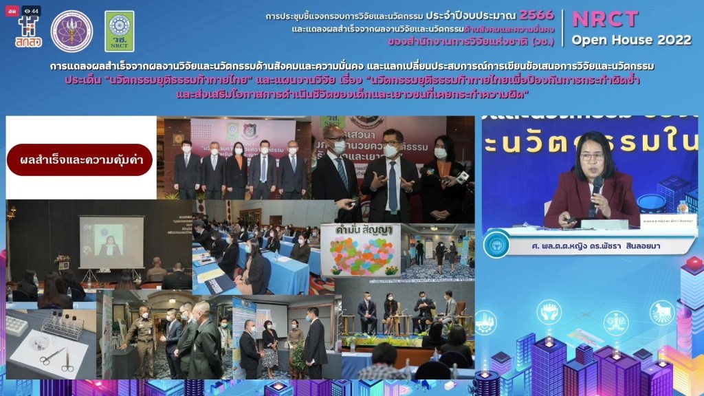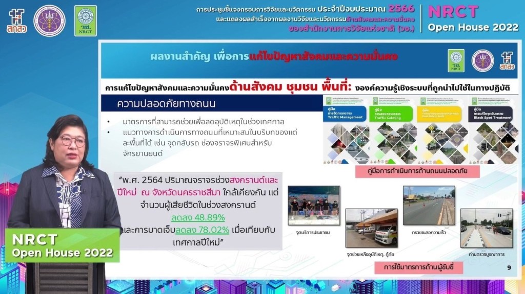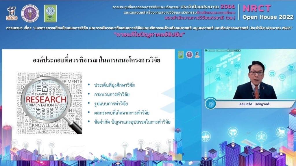 วันที่ 17 มิถุนายน 2565 สำนักงานการวิจัยแห่งชาติ (วช.) กระทรวงการอุดมศึกษา วิทยาศาสตร์ วิจัยและนวัตกรรม ได้จัดการประชุมชี้แจงกรอบการวิจัยและนวัตกรรมประจำปีงบประมาณ 2566 และแถลงผลสำเร็จจากการวิจัยและนวัตกรรมของสำนักงานการวิจัยแห่งชาติ (วช.) NRCT Open House 2022 “ด้านสังคมและความมั่นคง” ณ ห้องประชุมจอมพลสฤษดิ์ ธนะรัชต์ สำนักงานการวิจัยแห่งชาติ และออนไลน์ผ่านวีดิทัศน์ทางไกล (VDO Conference) ด้วยระบบ Zoom และการถ่ายทอดสด (Live Steaming) ผ่าน Facebook Live ของสำนักงานการวิจัยแห่งชาติ รวมทั้งแถลงผลสำเร็จจากการวิจัยและนวัตกรรมด้านสังคมและความมั่นคง รวมถึงเปิดโอกาสให้นักวิจัย และผู้ทรงคุณวุฒิของ วช. ได้แลกเปลี่ยนประสบการณ์การเขียนข้อเสนอการวิจัยและนวัตกรรมและการยื่นขอรับทุนของ วช. โดยมี ดร.วิภารัตน์ ดีอ่อง ผู้อำนวยการสำนักงานการวิจัยแห่งชาติ เป็นประธานเปิดการประชุม