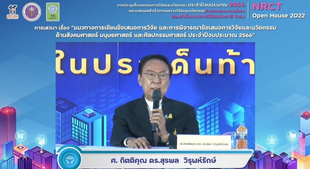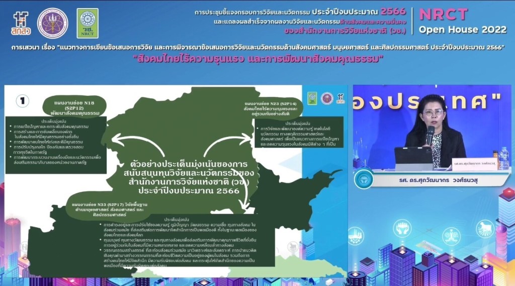 ดร.วิภารัตน์ ดีอ่อง ผู้อำนวยการสำนักงานการวิจัยแห่งชาติ กล่าวว่า วช. ภายใต้กระทรวง อว. เป็นหน่วยงานหลักในการบริหารทุนวิจัยและนวัตกรรมของประเทศ โดยมุ่งเน้นผลสำเร็จจากการวิจัยที่สามารถนำไปใช้ประโยชน์ในมิติต่างๆ โดยประเทศไทยในครึ่งปีแรกของปี 2565 กำลังเริ่มฟื้นตัวจากผลกระทบการแพร่ระบาดของ COVID-19 ไม่ว่าจะเป็นเรื่องการจ้างงานที่ปรับตัวลดลง แต่อย่างไรก็ตามก็ยังมีปัญหาที่ยังคงส่งผลกระทบต่อสังคมและความมั่นคงของประเทศไทยที่ยังเกิดขึ้นอยู่ เช่น เรื่องหนี้สินครัวเรือนที่ยังเพิ่มขึ้น ความเหลื่อมล้ำที่ยังคงเป็นปัญหาฝังรากลึกในสังคมไทยมาอย่างช้านาน และปัญหาทางด้านสังคมต่างๆที่เกิดขึ้นในปัจจุบัน โดย วช. ได้เล็งเห็นความสำคัญของงานวิจัยด้านสังคมที่จะนำไปใช้ในการตอบโจทย์ปัญหาของประเทศและเตรียมพร้อมในการรับมือสถานการณ์สังคมของประเทศไทยที่เกิดขึ้นด้วยการให้ทุนวิจัยและนวัตกรรมในประเด็นสำคัญต่างๆ โดยวางเป้าหมายเพื่อสร้างสังคมที่พัฒนาอย่างยั่งยืนและมีความมั่นคงในทุกมิติ จำนวน 7 กลุ่มเรื่อง ได้แก่ 1) กลุ่มเรื่อง คนไทย 4.0 เพื่อสังคมคุณธรรม 2) กลุ่มเรื่อง การเสริมสร้างธรรมาภิบาลและแก้ไขปัญหาคอร์รัปชัน 3) กลุ่มเรื่องสังคมไทยไร้ความรุนแรง 4) กลุ่มเรื่องความปลอดภัยทางถนน 5) กลุ่มเรื่องมนุษยศาสตร์ 6) กลุ่มเรื่องสร้างสรรค์วิชาการงานศิลป์ 7) กลุ่มเรื่อง การวิจัยและพัฒนาสุนทรียภาพและความคิดสร้างสรรค์ของด้านศิลปกรรม”