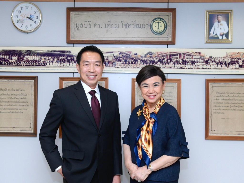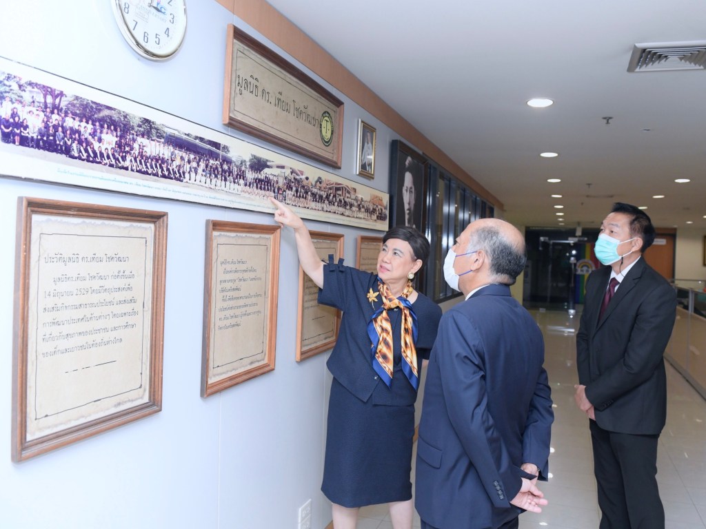 ดร. ศิรินา ปวโรฬารวิทยา (กลางขวา) ประธานมูลนิธิ ดร.เทียม โชควัฒนา เป็นตัวแทน มูลนิธิ ดร.เทียม โชควัฒนา รับมอบเงินบริจาค จำนวน 1,500,000 บาท (หนึ่งล้านห้าแสนบาท) จาก มร. โชอิจิ โอกิวาร่า (ที่ 2 จากซ้าย) ประธานบริษัท ไทย-เอ็มซี จำกัด และ นายสันติพงษ์ บูรณกฤตยากรณ์ (ซ้ายสุด) ผู้จัดการทั่วไป บริษัท มิตซูบิชิ เอลเลเวเตอร์ (ประเทศไทย) จำกัด โดยเป็นผู้แทนส่งมอบ เพื่อสมทบทุนใน “โครงการปันสุขอิ่มใจ” เพื่อช่วยเหลือบรรเทาทุกข์ให้กับประชาชนที่ได้รับผลกระทบในสถานการณ์โควิด-19 ในรูปแบบต่าง ๆ อาทิ การสนับสนุนสินค้าอุปโภค-บริโภค เป็นต้น ทั้งนี้ ส่งมอบ ณ มูลนิธิ ดร.เทียม โชควัฒนา