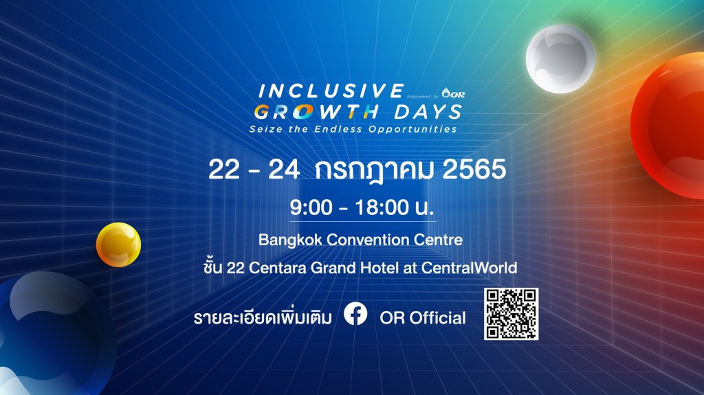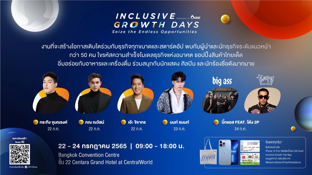 โออาร์ เชิญชวนผู้ประกอบการธุรกิจทุกขนาด สตาร์ตอัป และผู้สนใจร่วมเส้นทางเติมเต็มโอกาสเพื่อการเติบโตไปด้วยกันในงานเสวนาและโชว์เคสธุรกิจครั้งยิ่งใหญ่แห่งปี “Inclusive Growth Days empowered by OR” ระดม 50 ผู้ทรงคุณวุฒิ และนักธุรกิจชั้นนำ ร่วมเจาะลึกโมเดลธุรกิจแห่งอนาคตที่จะมาช่วยต่อยอดการลงทุน ผู้เชี่ยวชาญวงการสตาร์ตอัปมาไขรหัสแห่งความสำเร็จ พร้อมทั้งการจัดแสดงสินค้า นวัตกรรม และเทคโนโลยีจากพันธมิตรของ โออาร์ ที่จะยกระดับธุรกิจให้เติบโตไปพร้อมกับสังคมและสิ่งแวดล้อม พร้อมโอกาสในการสรรหาพันธมิตร สร้างเครือข่ายทางธุรกิจ เพื่อร่วมเติมเต็มศักยภาพและก้าวสู่ความสำเร็จไปด้วยกัน เพลิดเพลินกับการช้อปปิ้งสินค้าไทยเด็ด อิ่มอร่อยกับอาหารและเครื่องดื่มจากร้านค้าและแบรนด์ชั้นนำ รวมถึงความบันเทิงจากศิลปินนักร้อง นักแสดงชั้นนำ และแขกรับเชิญเซเลบริตี้มากมาย ตั้งแต่ 22 – 24 กรกฎาคม 2565 ที่ บางกอกคอนเวนชันเซ็นเตอร์ เซ็นทรัลเวิลด์ ชั้น 22 ลงทะเบียนเข้าร่วมงานฟรีที่ https://www.zipeventapp.com/e/Inclusive-Growth-Days
