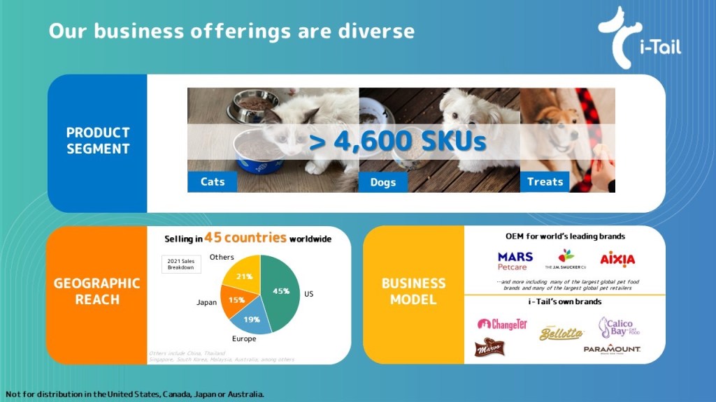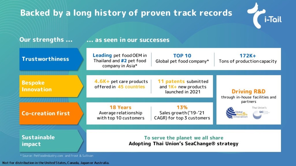31 มี.ค. 2565 บริษัทฯ มีรายการผลิตภัณฑ์ที่จำหน่ายรวมกว่า 4,600 ชนิดให้กับแบรนด์ชั้นนำระดับโลก และการผลิตแบรนด์อาหารสัตว์เลี้ยงภายใต้ตราสินค้าของตนเอง พร้อมเดินหน้าเต็มที่หลังปรับโครงสร้างสู่การเป็นแฟล็กชิพของไทยยูเนี่ยนด้านผลิตภัณฑ์อาหารสัตว์เลี้ยงระดับโลก โดยมีผลิตภัณฑ์ที่มีคุณค่าทางโภชนาการซึ่งเป็นผลลัพธ์จากความมุ่งมั่นของทีมวิจัยและพัฒนาตลอดจนระบบนิเวศเชิงนวัตกรรมที่มีความแข็งแกร่ง ด้วยศักยภาพกำลังการผลิตรวม 172,786 ตัน/ปี ทำให้บริษัทเติบโตรุดหน้าด้วยยอดขายที่มีอัตราการเติบโตเฉลี่ยต่อปีกว่า 15% ในช่วง 3 ปีที่ผ่านมา สู่ยอดขายรวม 14,529 ล้านบาทในปี 2564