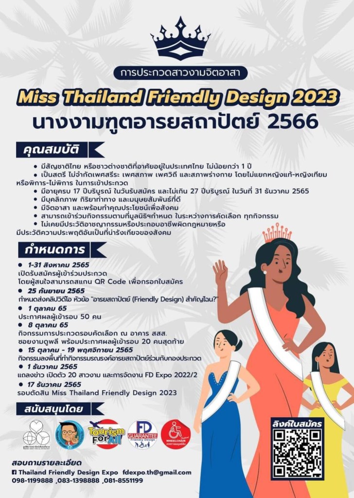 เปิดเวทีประวัติศาสตร์สำหรับสาวงามจิตอาสา เข้าประกวดชิงตำแหน่งเกียรติยศ Miss Thailand Friendly Design 2023 : นางงามฑูตอารยสถาปัตย์ 2566 เปิดรับสมัครตั้งแต่วันนี้ ถึงวันที่ 31 สิงหาคม 2565