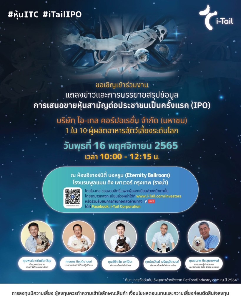 บริษัท ไอ-เทล คอร์ปอเรชั่น จำกัด (มหาชน) หรือ ITC ผู้นำธุรกิจผลิตอาหารสัตว์เลี้ยงครบวงจร ซึ่งปัจจุบันมีขนาดใหญ่ที่สุดอันดับ 2 ของเอเชีย และอยู่ใน 10 อันดับแรกของโลก ขอเชิญนักลงทุนและผู้สนใจร่วมฟังการบรรยายสรุปข้อมูลการเสนอขายหุ้นสามัญต่อประชาชนเป็นครั้งแรก (IPO) เพื่อร่วมเป็นส่วนหนึ่งของการเติบโตไปกับบริษัท ซึ่งนับเป็นการจัดไอพีโอโร้ดโชว์เต็มรูปแบบครั้งแรกในแวดวงตลาดทุนของไทยหลังสถานการณ์โควิดคลี่คลาย เพื่อให้ผู้ร่วมงานได้สัมผัสถึงจุดเด่นและความน่าสนใจของหุ้น ITC อย่างใกล้ชิด