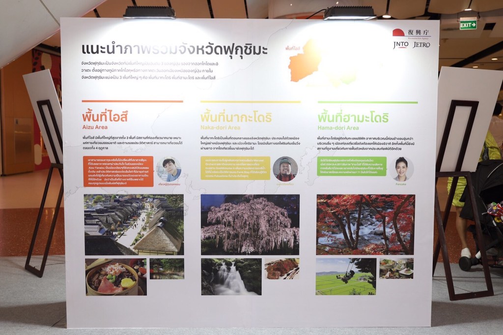 โดยในงานนี้มีการจัดนิทรรศการและกิจกรรมด้านการท่องเที่ยวมากมาย ทั้งกิจกรรมบนเวที การแสดงดนตรีโคโตะ การออกบูธ และเวิร์กช็อปทำข้าวปั้นโอนิกิริและเวิร์กช็อประบายสีตุ๊กตาล้มลุก รวมทั้งพบปะพูดคุยกับ แพนเค้ก – เขมนิจ จามิกรณ์ นักแสดงสาวชื่อดังของเมืองไทย ที่เคยเป็นอาสาสมัครในการช่วยเหลือผู้ประสบภัยจากภัยพิบัติดังกล่าว ร่วมพูดคุยบนเวทีถึงประสบการณ์ความประทับใจที่ได้ไปเยือนจังหวัดฟุกุชิมะ