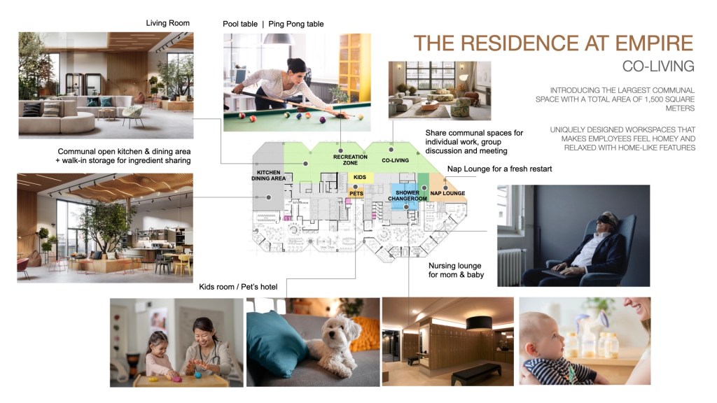 ภายใต้แนวคิด “Co-Living Collective: Empower Future” เอ็มไพร์เตรียมพื้นที่กว่า 1,500 ตารางเมตร บนชั้น 53 สร้าง The Residence at Empire Co-living พื้นที่ทำงานซึ่งเป็นบริการพิเศษสำหรับผู้เช่า มีการออกแบบตกแต่งที่เป็นเอกลักษณ์เฉพาะตัวให้มีบรรยากาศเหมือนบ้านอันอบอุ่นและผ่อนคลาย ด้วยองค์ประกอบต่าง ๆ เช่น ห้องนั่งเล่น พื้นที่สันทนาการเพื่อการพักผ่อน เพลิดเพลินกับเกมคอนโซล โต๊ะพูล และโต๊ะปิงปอง ห้องครัวแบบเปิดส่วนกลาง และพื้นที่รับประทานอาหาร ห้องสำหรับเด็ก และพื้นที่สำหรับสัตว์เลี้ยง ห้องเปลี่ยนผ้าอ้อม สำหรับโซนพื้นที่ทำงานร่วมกัน ประกอบด้วยพื้นที่ส่วนกลาง และพื้นที่ทำงานส่วนตัว พื้นที่สำหรับสนทนากลุ่มและประชุม ตลอดจนโซนเพื่อการผ่อนคลายร่างกายและจิตใจ ประกอบด้วย Nap Lounge สำหรับการพักผ่อนเติมพลัง ห้องอาบน้ำ และห้องเปลี่ยนเสื้อผ้า