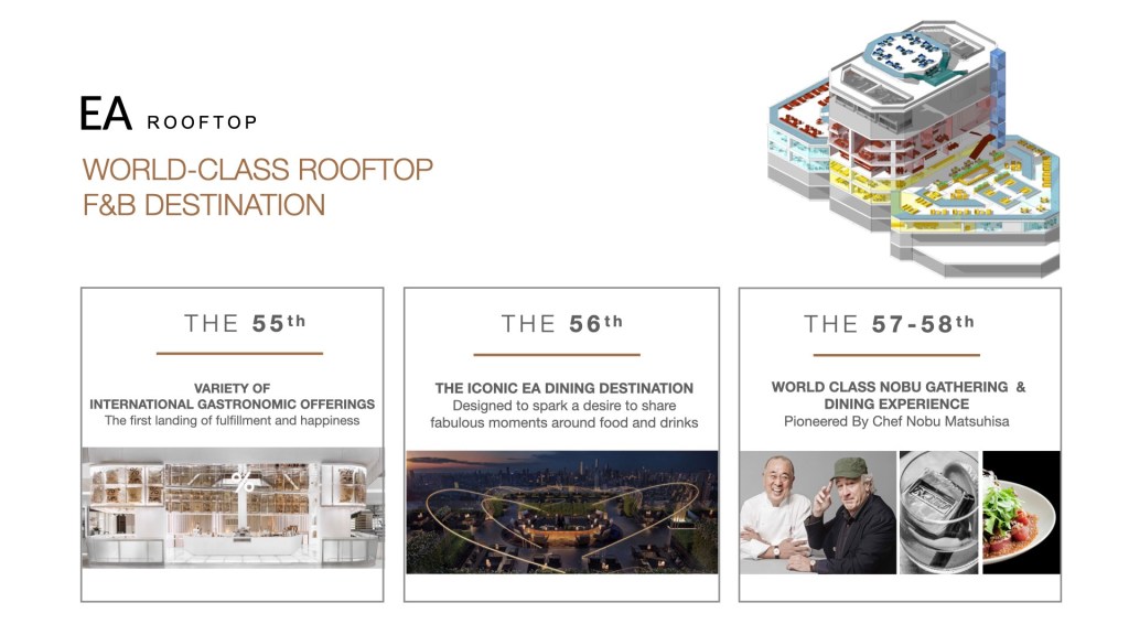 นอกจากนั้น ภายในปีนี้ เอ็มไพร์ ยังเตรียมเปิด EA Rooftop จุดหมายด้านอาหารและเครื่องดื่มบนยอดตึกแห่งใหม่ที่ใหญ่ที่สุดในประเทศไทย ด้วยพื้นที่กว่า 8,460 ตารางเมตร บนชั้น 55 – 58 รวบรวมประสบการณ์การรับประทานอาหารเหนือระดับจากหลายหลายแบรนด์ที่มีชื่อเสียงระดับโลกไว้ในที่เดียว ชูแนวคิดการออกแบบ “EA” (เอ-ยา) ซึ่งแปลว่า “เสรีภาพ อากาศ การเฉลิมฉลอง” เพื่อมอบประสบการณ์ที่เหนือระดับและชวนดื่มด่ำจากแบรนด์ภัตตาคารและร้านอาหารชื่อดังระดับโลกมากมายซึ่งหาไม่ได้จากที่อื่นในกรุงเทพฯ นำโดยภัตตาคารโนบุ และอื่น ๆ อีกมากมาย