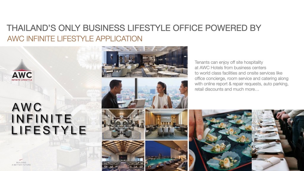 AWC ยังมอบประสบการณ์การบริการจากโรงแรมผ่านแอพพลิเคชั่น AWC Infinite Lifestyle (AWI) สำหรับผู้เช่าสำนักงานเพื่อเข้าถึงบริการต่าง ๆ ได้อย่างเต็มรูปแบบ ทั้ง Business Center, Club Lounge และส่วนลดพิเศษของการบริการต่างๆ จากโรงแรมในเครือ AWC ทั้งหมด พร้อมทั้งเดินหน้าสร้างคุณค่าที่ยั่งยืน และขณะนี้อยู่ระหว่างการขอรับรองมาตรฐาน LEED ซึ่งเป็นมาตรฐานอาคารเขียวที่ยั่งยืน และมาตรฐาน WELL เพื่อส่งเสริมสุขภาวะที่ดีของผู้ใช้อาคารและผู้มาเยือน