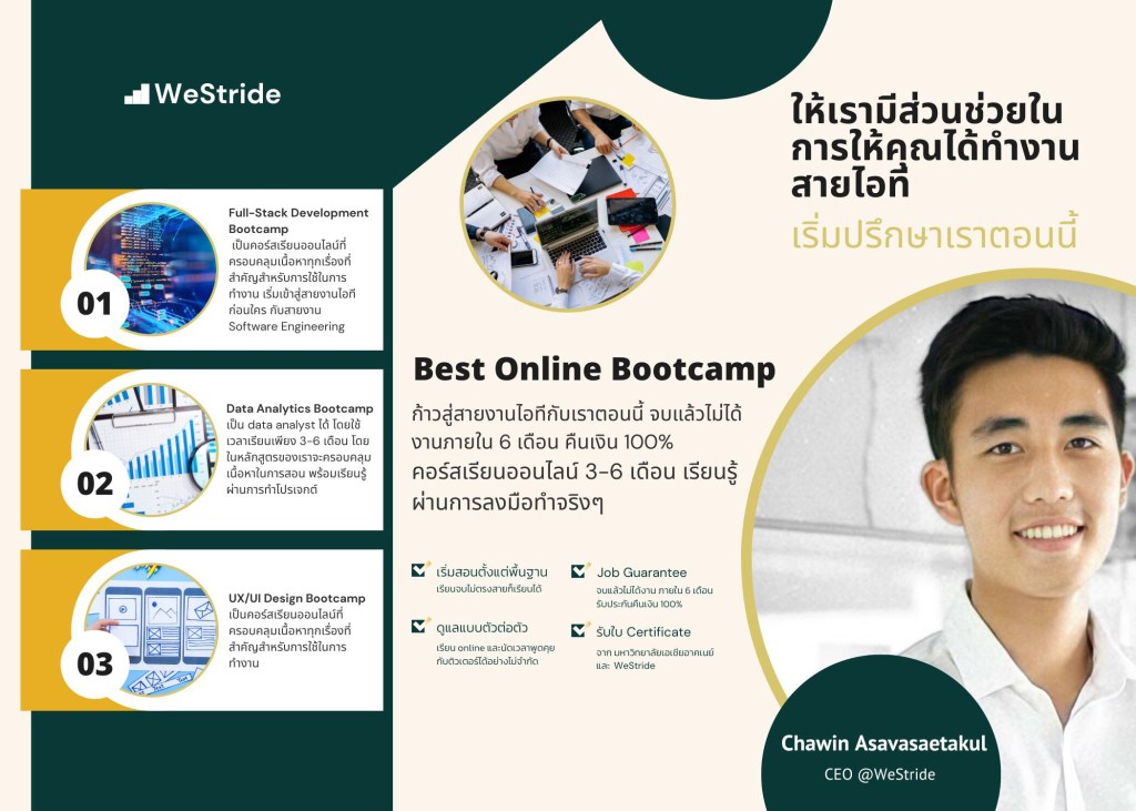สำหรับ Bootcamp คือสถาบันสอนและเหมาะต่อการเพิ่มทักษะใหม่ด้านเทคโนโลยี ที่สอดคล้องกับความต้องการของนายจ้าง และเหมาะกับผู้ที่ต้องการเตรียมตัวเปลี่ยนสายอาชีพสู่สายเทคโนโลยี ที่กำลังอยู่ในสภาวะขาดตลาดอย่างมาก โดย WeStride เชื่อมั่นว่า การเรียนรู้ไม่จำเป็นต้องอยู่ในระดับมหาวิทยาลัย เท่านั้น แต่สามารถเรียนรู้และพัฒนาทักษะในรูปแบบ คอร์สเรียน และ เรียนรู้ผ่านการทำโปรเจกต์ ได้อย่างเต็มที่ ด้วยการแบ่งเนื้อหาให้เข้าใจง่ายและสั้นกระชับ มุ่งเน้นความรู้ ความเข้าใจ และการลงมือปฏิบัติจริง เพื่อให้เกิดเรียนรู้และฝึกฝนทักษะ ควบคู่ไปด้วยกันอย่างจริงจัง