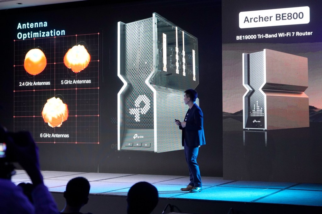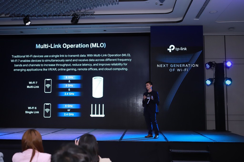 นายหง หัวเฟิง, ผู้จัดการผลิตภัณฑ์บริษัท ทีพี-ลิงค์ เอ็นเตอร์ไพรส์ (ประเทศไทย) จำกัด กล่าวนำเสนอผลิตภัณฑ์ใหม่ที่มาพร้อมกับเทคโนโลยี Wi-Fi 7 ว่า เทคโนโลยี Wi-Fi 7 ถือเป็นก้าวสำคัญในการพัฒนาเครือข่าย โดยให้ความเร็วที่สูงขึ้นจาก Wi-Fi 6 ถึง 4.8 เท่า มีค่าลาเทนซีลดลง 100 เท่า และรองรับการใช้งานสูงขึ้นถึง 5 เท่า สามารถรับส่งข้อมูลด้วยความเร็วสูงสุดถึง 46 Gbps เพื่อการใช้งานที่แสนรวดเร็ว มาพร้อมเทคโนโลยีต่าง ๆ เช่น Multi-Link Operation, Bandwith 320 MHz, 16 x 16 Mu-MIMO, 4K-QAM, Multi-RU, และ Preamble Puncturing ที่จะช่วยให้เครือข่าย Wi-Fi มีการรับส่งข้อมมูลอย่างมีประสิทธิภาพ สามารถรับชมวิดีโอความละเอียดสูง 4K หรือ 8K ที่สมบูรณ์แบบ, เล่นเกมออนไลน์ขนาดใหญ่โดยไม่สะดุด, หรือทำการสตรีมสดจากคอมพิวเตอร์ที่บ้านได้อย่างลื่นไหลมากยิ่งขึ้น โดยกลุ่มผลิตภัณฑ์อุปกรณ์เครือข่ายที่มาพร้อมเทคโนโลยี Wi-Fi 7 ที่ทาง TP-Link นำมาเปิดตัวภายในงานประกอบด้วย