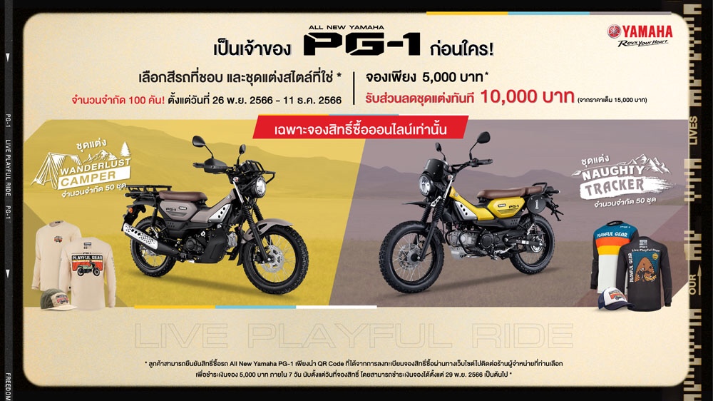หมายเหตุ :*หลังจากจองสิทธิ์ทางออนไลน์แล้ว ลูกค้าจะต้องนำ QR code ไปแสดงสิทธิ์ และชำระเงินจองมูลค่า 5,000 บาท เพื่อยืนยันสิทธิ์การจองรถจักรยานยนต์ All New YAMAHA PG-1 พร้อมชุดแต่ง ที่ร้านผู้จำหน่ายภายใน 7 วัน หากเกินกำหนดจะถือว่าสละสิทธิ์ โดยราคารถจักรยานยนต์ All New YAMAHA PG-1 จะแจ้งอย่างเป็นทางการวันที่ 29 พฤศจิกายน 2566 ซึ่งลูกค้าจะสามารถยืนยันการจองสิทธิ์ที่ร้านผู้จำหน่ายได้ ตั้งแต่วันที่ 29 พฤศจิกายน 2566 เป็นต้นไป (ลูกค้าที่จองสิทธิ์ทางออนไลน์วันที่ 26 – 28 พฤศจิกายน 2566 จะสามารถยืนยันสิทธิ์ที่ร้านผู้จำหน่ายวันแรกตั้งแต่ 29 พฤศจิกายน 2566 เป็นต้นไป)