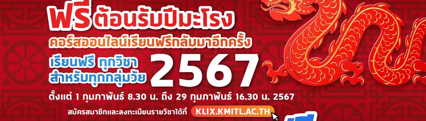 สถาบันเทคโนโลยีพระจอมเกล้าเจ้าคุณทหารลาดกระบัง (สจล.) โดย KMITL Learning Intelligence X หรือ KLIX ระบบการเรียนการสอนออนไลน์แบบไร้ขีดจำกัด ซึ่งมีหลักสูตรออนไลน์ กว่า 100 วิชา ให้ผู้ที่สนใจได้เรียนฟรีตลอดเดือนกุมภาพันธ์นี้ หรือตั้งแต่วันที่ 1- 29 กุมภาพันธ์ 2567 เวลา 08.30 – 16.30 น. สำหรับทุกกลุ่มวัย ทั้งนักเรียน นิสิต นักศึกษา บุคคลทั่วไป เพื่อเพิ่มทักษะการเรียนรู้ด้านต่าง ๆ พร้อมได้รับประกาศณียบัตรเมื่อเรียนจบคอร์ส