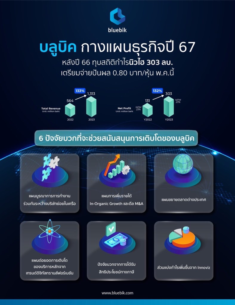 บริษัท บลูบิค กรุ๊ป จำกัด (มหาชน) หรือ BBIK ที่ปรึกษาชั้นนำผู้ให้บริการด้านดิจิทัลทรานส์ฟอร์เมชัน ครบวงจร เปิดแผนธุรกิจปี 2567 เดินหน้าขยายฐานลูกค้าแบบ 360 องศา ครอบคลุมลูกค้าขนาดกลาง – ใหญ่ ทั้งในและต่างประเทศ หลังแผน Synergy การทำงานร่วมกันระหว่างบริษัทในเครือประสบความสำเร็จ ปักหมุดรุกตลาดที่มีศักยภาพเติบโตสูงในเอเชียตะวันออกเฉียงใต้ เล็งใช้ประโยชน์จากบริษัทในเครือเพื่อขยายฐานลูกค้าเพิ่ม ผนวกกับแนวโน้มการลงทุนด้านดิจิทัลทรานส์ฟอร์เมชันทั่วโลกยังเติบโตถึง 10% หรือราว 2.51 ล้านล้านดอลลาร์สหรัฐในปีนี้ ทำให้บริษัทฯ มั่นใจว่าผลประกอบการปี 2567 สามารถโต 50% ตามเป้าหมายที่วางไว้ โดยผลประกอบการปี 2566 โตกว่าเป้า มีกำไรสุทธิ 303 ล้านบาท เพิ่มขึ้น 132% เมื่อเทียบกับปีที่ผ่านมา (YoY) และรายได้อยู่ที่ 1,313 ล้านบาท โตขึ้น 133% (YoY)