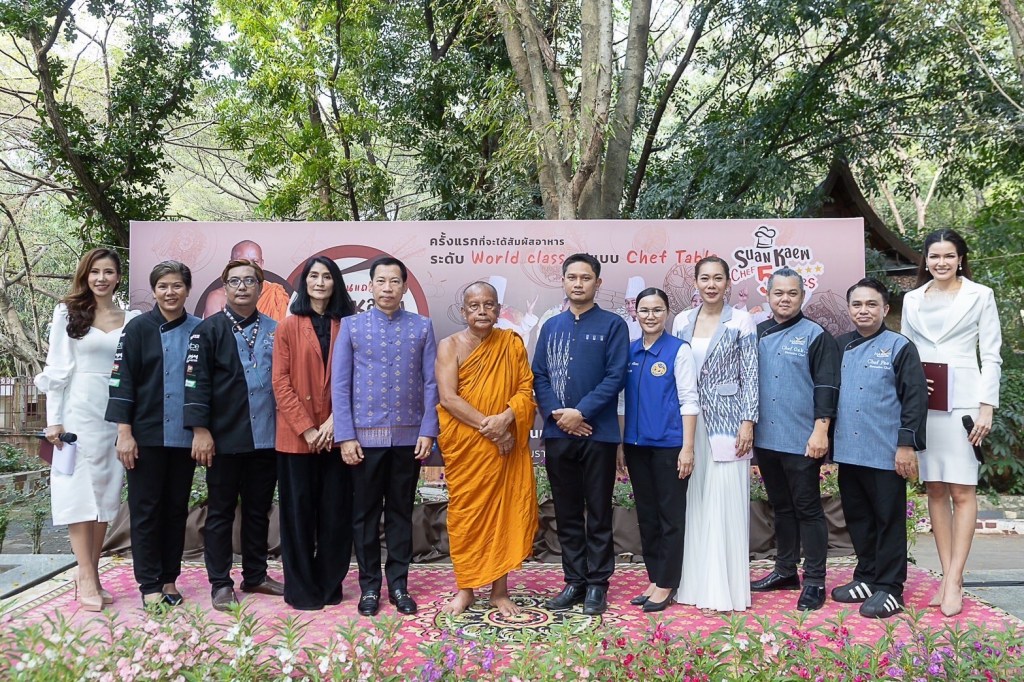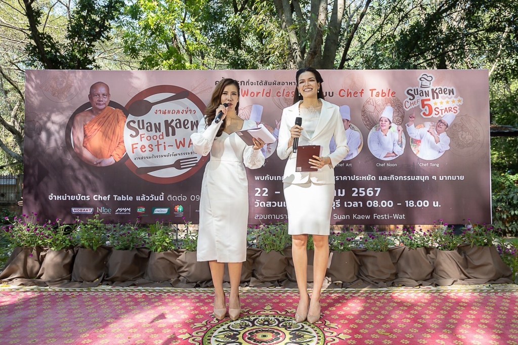 วัดสวนแก้ว ผลักดันผลิตผลท้องถิ่นสู่เมนูระดับโลก ต่อยอดผลผลิตจากทางวัด จัดแถลงข่าวงาน “Suan Kaew Food Festi-Wat (งานสวนแก้วรวมพลังวัฒนธรรมอาหาร)” งานแฟร์ครั้งแรกของวัดสวนแก้ว โดย 2 พิธีกรสาวสวย “ฟ้าใส-ปวีณสุดา ดรูอิ้น” มิสยูนิเวิร์สไทยแลนด์ 2019 , ท็อป 5 มิสยูนิเวิร์ส 2019 และ “เทวี-ฤาชนก มีแสง” มิสอินเตอร์เนชั่นแนล ไทยแลนด์ 2022 เปิดตัว 5 เชฟกิตติมศักดิ์ พร้อมจัดตัวอย่าง Chef Table เพื่อยกระดับ Local สู่เลอค่า และให้เปิดชิม 30 ร้านตัวอย่าง ที่ผ่านมาตรฐาน Suan Kaew Chef 5 stars หรือ สวนแก้วเชฟ 5 ดาว ที่การันตรีความอร่อยระดับ 5 ดาว จาก 5 เชฟกิตติมศักดิ์ ที่ช่วยกันคัดสรรร้านค้าหน้าเก่าหน้าใหม่ ร้านเล็กร้านใหญ่ให้ได้รับโอกาสออกบูธขายฟรี ในงาน “Suan Kaew Food Festi-Wat (งานสวนแก้วรวมพลังวัฒนธรรมอาหาร)” ที่จะมีขึ้นระหว่างวันที่ 22-31 มีนาคม 2567 ตั้งแต่เวลา 08.00–18.00 น. ที่วัดสวนแก้ว จ.นนทบุรี