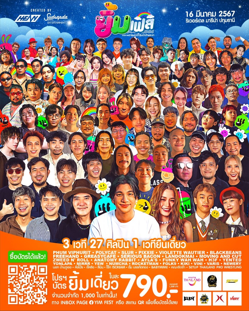 เทศกาลดนตรี “Yim Fest – #ยิ้มเฟส 2024” เทศกาลดนตรีอารมณ์ดี ริมน้ำเจ้าพระยา พบกับ สาวเสียงดี วี – วิโอเลต วอเทียร์ นำทีมเหล่าศิลปิน โพลีแคท, PHUM VIPHURIT, FUNKY WAH WAH, GREASY CAFE, สเลอ, PIXXIE, H3F, FOLK9, SERIOUS BACON, ZWEED N’ROLL, MOVING AND CUT, ANATOMY RABBIT, YEW, YENTED, MIRRR, VINI, YONLAPA, LANDOKMAI, NUMCHA, BLACKBEANS, FREEHAND, VARIS, KIKI, AYLA’S, NEWERY, ROCKETMAN ชวนทุกคนมายิ้มกันที่งาน “Yim Fest – ยิ้มเฟส 2024” เทศกาลอารมณ์ดี ริมน้ำเจ้าพระยา จัดโดยเฮฟวี่ ออร์แกไนเซอร์ ร่วมกับสุดสัปดาห์ เอนเตอร์เทนเมนต์ จัดเต็ม 3 เวที 27 ศิลปิน พร้อม 1 เวทียืนเดี่ยวกับเหล่าคอมเมเดี้ยนทั่วฟ้าเมืองไทย นอท บ้านกูเอง, คังโป้ย, เจ้หลิง, ลินิน, โจ๊ก iScream, ตั้ม บรรทัดทอง, BABYMIME และโชว์สุดพิเศษมวยปล้ำทีม SETUP THAILAND PRO WRESTLING วันเสารที่ 16 มีนาคม 67 ณ ริเวอร์เดล มาริน่า #ปทุมธานี