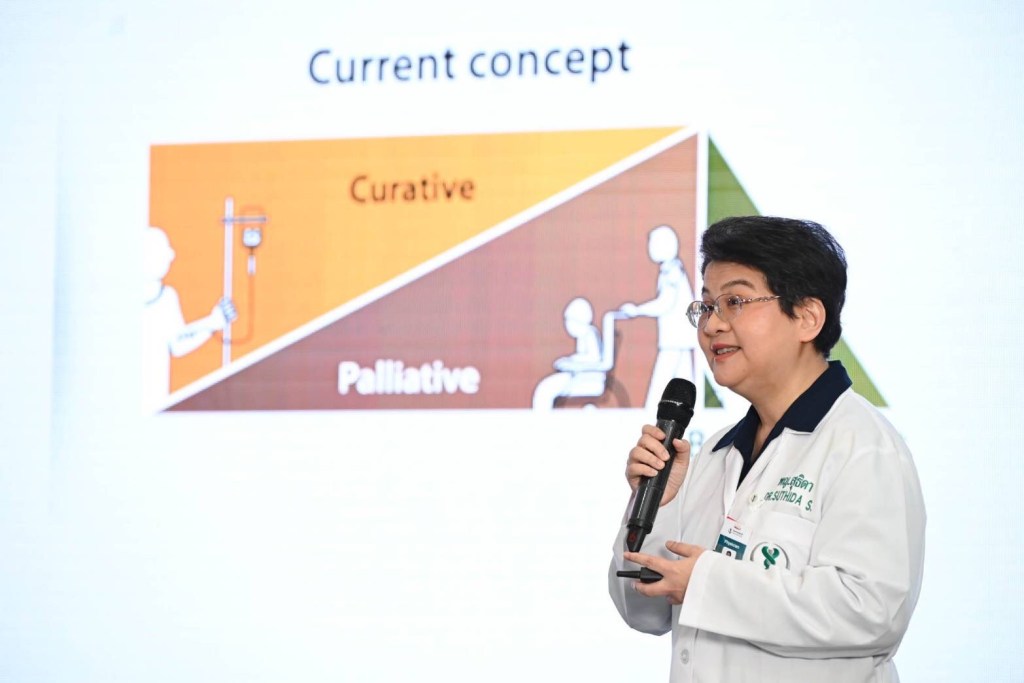 พญ. สุธิดา สุวรรณเวโช แพทย์ชำนาญการด้านมะเร็งวิทยา และ Palliative Care โรงพยาบาลบำรุงราษฎร์ กล่าวว่า การดูแลแบบประคับประคอง สำหรับผู้ป่วยมะเร็งระยะสุดท้าย (Palliative Cancer Care) เป็นการดูแลที่มุ่งเน้นการเพิ่มคุณภาพชีวิตของผู้ป่วยและครอบครัว ช่วยลดความทุกข์ทรมานทั้งด้านร่างกาย จิตใจ สังคม และจิตวิญญาณ โดยจะคำนึงถึงความต้องการและความปรารถนาของผู้ป่วยและครอบครัวร่วมด้วยเสมอ โดยศูนย์มะเร็งฮอไรซันมีทีม Palliative Tumor Board ประกอบด้วยทีมแพทย์และพยาบาลผู้เชี่ยวชาญด้านการดูแลแบบประคับประคองที่จะคอยติดตามประเมินอาการและให้การดูแลในทุกมิติอย่างใกล้ชิด นอกจากนี้ เรายังได้ร่วมมือกับบัณฑิตวิทยาลัย จุฬาลงกรณ์มหาวิทยาลัย นำดนตรีบำบัดเข้ามาดูแลผู้ป่วยเพื่อช่วยให้ผู้ป่วยรู้สึกผ่อนคลายได้ดียิ่งขึ้น