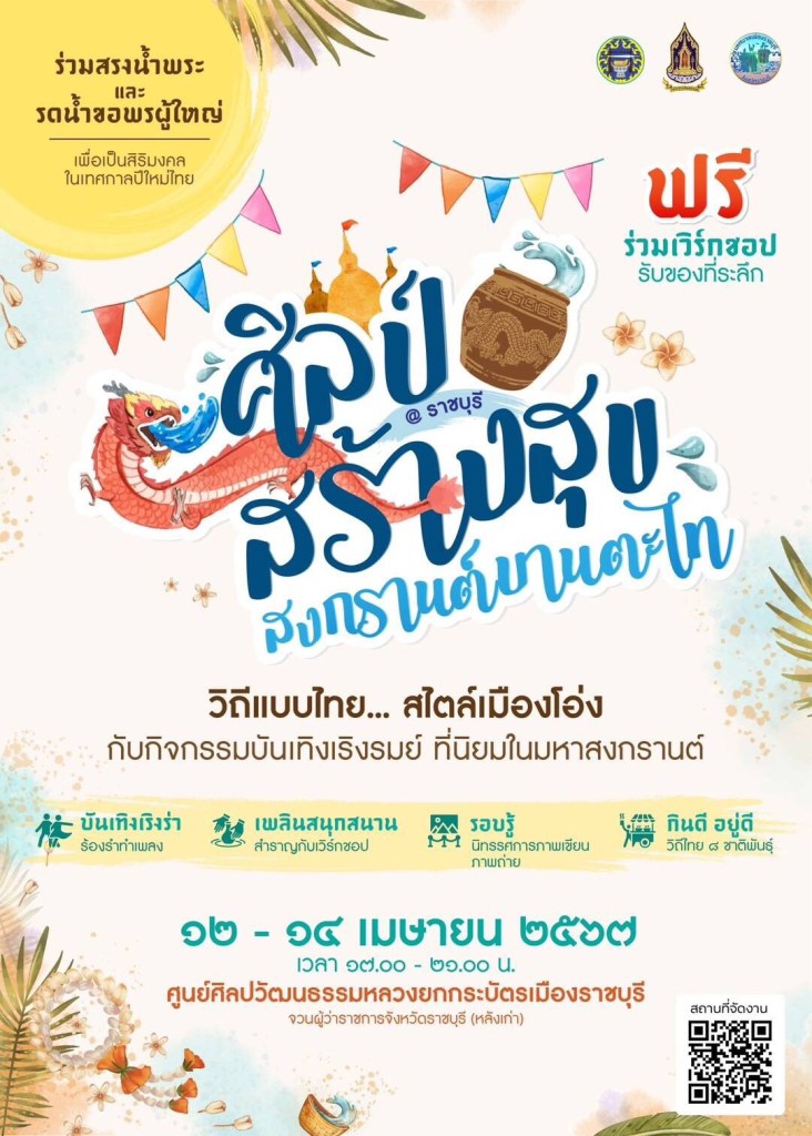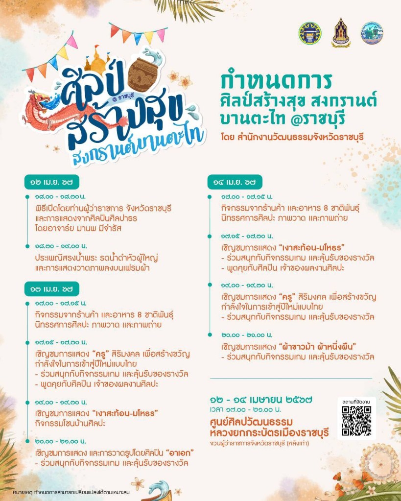 จังหวัดราชบุรี สำนักงานวัฒนธรรมจังหวัดราชบุรี ร่วมกับ หน่วยงานภาครัฐ ภาคเอกชน และกลุ่มศิลปิน พร้อมปลุกเศรษฐกิจ!! จัดงานมหาสงกรานต์ 3 วัน ดึงดูดนักท่องเที่ยวที่มีใจรักในงานศิลป์ มาเที่ยวงานนี้ ร่วมอนุรักษ์ประเพณีสงกรานต์ไทย และต่อยอดให้กับงานศิลปะที่แสดงถึงความเป็นมา และอัตลักษณ์ของจังหวัดราชบุรี เพื่อส่งเสริมสนับสนุนศิลปินอิสระทุกสาขาให้เป็นที่รู้จักมากยิ่งขึ้น สนุกสนาน มหาสงกรานต์ บันเทิงเริงศิลป์ ตลอด 3 วันเต็ม 12-14 เมษายน เชิญทุกท่านมาร่วมเสพงานศิลป์ ให้มีความสุขกันถ้วนหน้า สงกรานต์นี้ ที่ราชบุรี