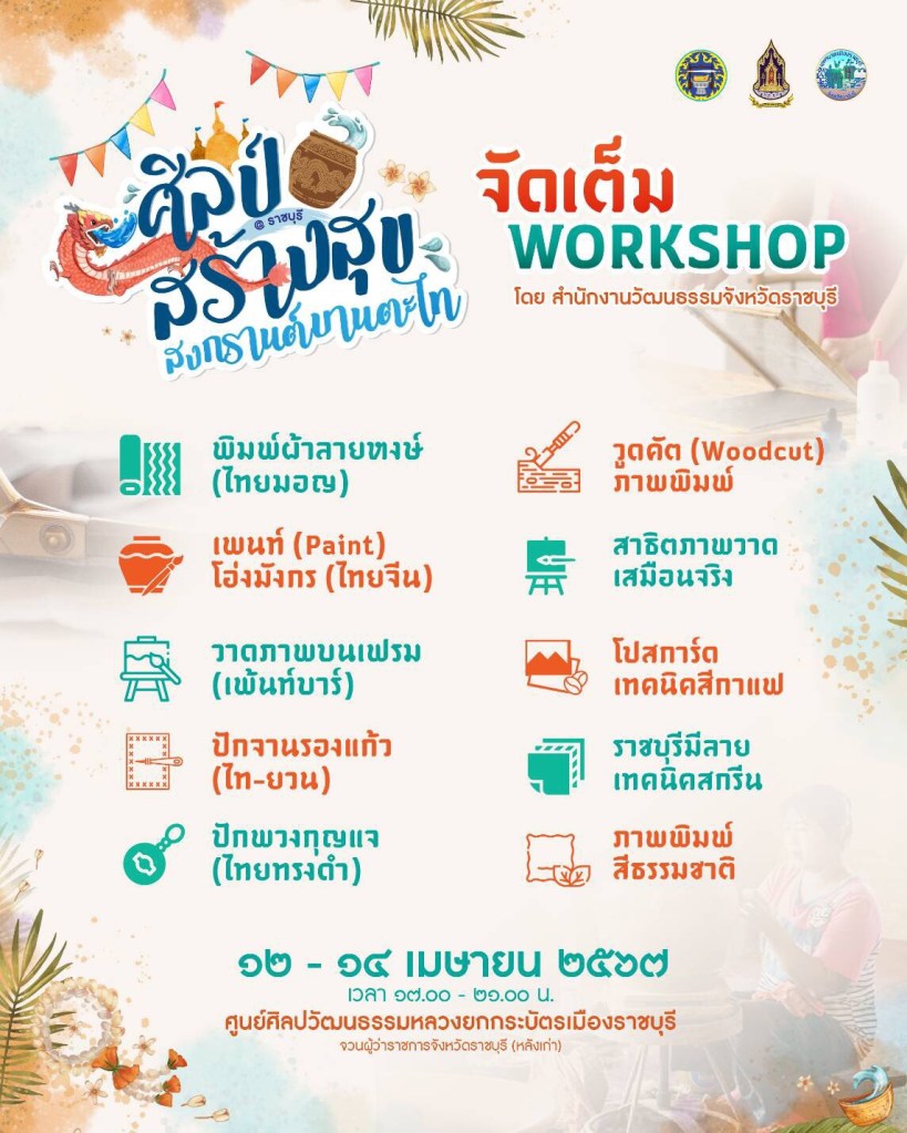 ชวนเที่ยวงาน ที่จังหวัดราชบุรี “งานศิลป์ สร้างสุข สงกรานต์บานตะไท” จัดขึ้นระหว่าง วันที่ 12-14 เมษายน 2567 ณ ศูนย์ศิลปวัฒนธรรมหลวงยกกระบัตรเมืองราชบุรี หรือจวนผู้ว่าราชการจังหวัดหลังเก่า…พบกับ งานแสดงผลงานศิลปะ นำโดย อาเอก ,อาเล็ก กลุ่มศิลปินลุ่มแม่น้ำแม่กลอง ,ชมนิทรรศการภาพถ่าย การบอกเล่าเรื่องราวเมืองโอ่ง โดยกลุ่มศิลปินลุ่มแม่น้ำแม่กลอง ,สาธิตการ ทำอาหารพื้นถิ่น ต้นตำรับจาก 8 ชาติพันธุ์, เพลิดเพลินกับกิจกรรมเวิร์กชอป อาทิ พิมพ์ผ้าลายหงส์ (ไทย-มอญ) ,สอนเพนท์โอ่งมังกร ,งานปักผ้า ,สาธิต สอนเทคนิคการวาดภาพ เสมือนจริง ,เทคนิคภาพพิมพ์สีธรรมชาติ ,ทำโปสการ์ดด้วยเทคนิคสี กาแฟ ,สอนเทคนิคสกรีนสี เป็นต้น ชวนชิม ช้อป สินค้าดีมีคุณภาพจากร้านในชุมชน ,ชมการแสดงร่วมสมัยจากศิลปินศิลปาธร เป็นต้น