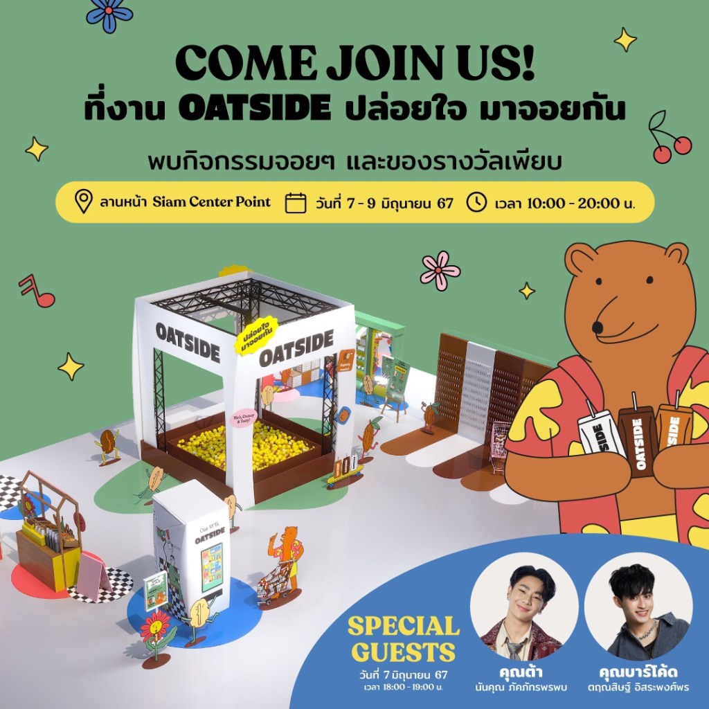 กรุงเทพฯ 6 มิถุนายน 2567 – โอ๊ตไซด์ (OATSIDE) นมโอ๊ตคุณภาพพรีเมี่ยม ชวนวัยมันส์มาจอยกันที่งาน “OATSIDE ปล่อยใจ มาจอยกัน” งานที่จะพาทุกคนไปสนุกกับกิจกรรม เพื่อลุ้นรับรางวัลมากมาย อาทิ เกมอินเตอร์แอคทีฟ OATSIDE Photo Hunt ตามล่าหากล่องโอ๊ตไซด์ขนาดใหม่ ให้ครบทุกรสชาติ กิจกรรม TikTok Challenge กับฟิลเตอร์สุดคิวท์ และไฮไลท์ของงาน ลุ้นคว้า รางวัลใหญ่กินนมโอ๊ตไซด์ฟรีทั้งปี กับเกม Giant Claw Machine ที่ให้คุณสวมบทเป็นมือคีบตุ๊กตา ลงไปคว้ารางวัลด้วยตัวเอง และเตรียมกรี๊ดกับคู่จิ้นขวัญใจมัมหมี “ต้า นันคุณ และ บาร์โค้ด ตฤณสิษฐ์ ” ที่มาร่วมพูดคุยและเล่นเกมแจกรางวัลมากมาย