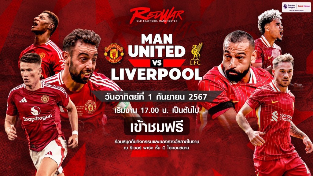 ทรูวิชั่นส์ เจ้าของลิขสิทธ์ถ่ายทอดสดพรีเมียร์ลีก อังกฤษ หนึ่งเดียวของประเทศไทย เอาใจแฟนฟุตบอลกับกิจกรรมพิเศษ ที่ทุกคนต่างรอคอย ปะทะเดือดศึกแห่งศักดิ์ศรี “RED WAR” ร่วมชมการเเข่งขันเกมสุดมันระหว่าง แมนเชสเตอร์ ยูไนเต็ด พบ ลิเวอร์พูล เชียร์มันชิดติดจอขนาดยักษ์ ริมแม่น้ำเจ้าพระยา พร้อมกระทบไหล่อินฟลูลูกหนังเมืองไทย พบกับกิจกรรมพิเศษมากมายให้ร่วมสนุก เข้าชมฟรีในวันอาทิตย์ที่ 1 กันยายนนี้ ตั้งแต่เวลา 17.00 น. เป็นต้นไปที่ ริเวอร์ พาร์ค ชั้น G ไอคอนสยาม และสามารถรับชมการถ่ายทอดสดได้ทางทรูวิชั่นส์ และแอปพลิเคชัน ทรูวิชั่นส์ นาว (ใหม่) ทางช่อง True Premier Football 1, 2 (600,602) และ True 4K (400) ตั้งแต่เวลา 22.00 น.