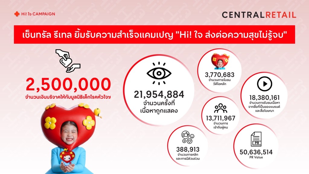 กรุงเทพฯ 27 พฤศจิกายน 2567 – บริษัท เซ็นทรัล รีเทล คอร์ปอเรชั่น จำกัด (มหาชน) ยิ้มรับความสำเร็จแคมเปญ “Hi! ใจ ส่งต่อความสุขไม่รู้จบ” ที่เปิดโอกาสให้ทุกคนได้ร่วมเป็นส่วนหนึ่งของการส่งต่อความสุข ผ่านการสนับสนุนสินค้าคอลเลกชันพิเศษทั้งอาร์ตทอยและเสื้อยืดน้อง Hi! ใจ ที่ออกแบบโดยครูปาน – สมนึก คลังนอก ศิลปินวาดภาพประกอบชื่อดัง ซึ่งตลอดระยะเวลาการจัดแคมเปญดังกล่าว สามารถรวบรวมยอดเงินจากการขายสินค้าได้ทั้งสิ้น 2,500,000 บาท ในระยะเวลาเพียง 8 เดือน พร้อมส่งมอบให้มูลนิธิเด็กโรคหัวใจ ในพระอุปถัมภ์ของสมเด็จพระเจ้าพี่นางเธอ เจ้าฟ้ากัลยาณิวัฒนา กรมหลวงนราธิวาสราชนครินทร์ เพื่อนำไปช่วยเหลือการผ่าตัดผู้ป่วยเด็กโรคหัวใจ อีกทั้งกระแสตอบรับผ่านสื่อออฟไลน์และออนไลน์ในช่องทางต่าง ๆ ยังได้รับความสนใจเป็นอย่างมาก จนมีเนื้อหาแคมเปญที่ถูกแสดงกว่า 21.9 ล้านครั้ง จำนวนผู้เข้าชมคลิปวิดีโอ Hi! ใจ กว่า 3.7 ล้านวิว จำนวนผู้เข้าชมเนื้อหาจากสื่อของ แบรนด์และสื่อโฆษณากว่า 18 ล้านครั้ง สามารถเข้าถึงผู้คนกว่า 13 ล้านครั้ง รวมถึงมียอดการคลิกไลก์ คอมเมนต์ แชร์และการมีส่วนร่วมถึง 3.8 แสนครั้งอีกด้วย