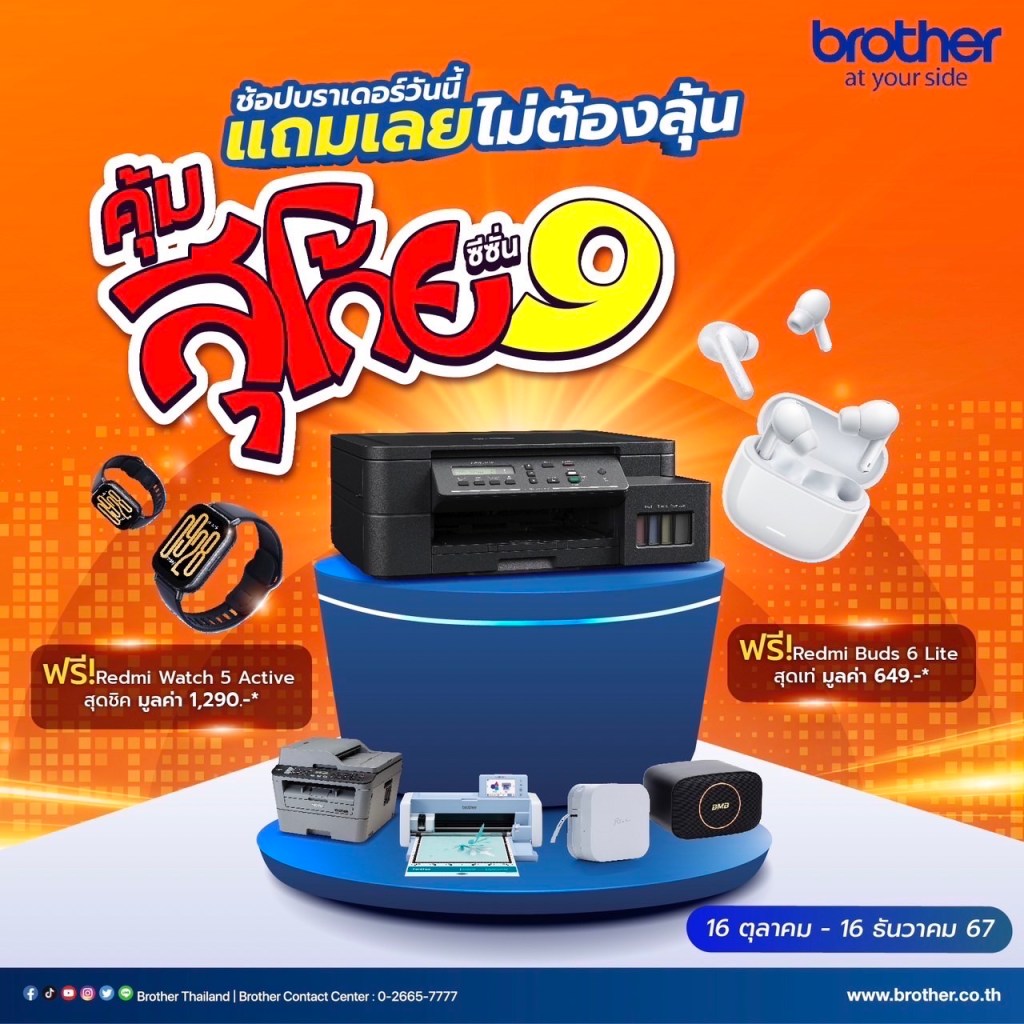 กรุงเทพฯ 6 ธันวาคม 2567 – บริษัท บราเดอร์ คอมเมอร์เชี่ยล (ประเทศไทย) จำกัด ชวนลูกค้าช้อปปิ้งสินค้าไอทีส่งท้ายปี ไม่ว่าจะใช้เองหรือมอบเป็นของขวัญต้องถูกใจแน่นอนกับแคมเปญสุดพิเศษ “บราเดอร์ คุ้มสุโก้ย ซีซั่น 9” เพียงซื้อสินค้าบราเดอร์ ในกลุ่ม อิงค์เจ็ทปริ้นเตอร์ เลเซอร์ปริ้นเตอร์ เครื่องสแกนและตัด รวมถึงชุดเครื่องเสียง รุ่นที่ร่วมรายการ รับทันทีของสมนาคุณพรีเมียม ได้แก่ Redmi Buds 6 Lite และ Redmi Watch 5 Active มูลค่าสูงสุด 1,290 บาท โดยสามารถแลกรับของสมนาคุณผ่าน LINE Official Account @brotherthailand ภายใน 15 วันหลังการซื้อ จำกัดของสมนาคุณ 1 ชิ้นต่อรุ่นสินค้าและเบอร์โทรศัพท์ (ไม่จำกัดจำนวนการซื้อ) สำหรับลูกค้าที่ซื้อสินค้าระหว่างวันที่ 16 ตุลาคม – วันที่ 16 ธันวาคม 2567 เท่านั้น ต้องการสอบถามข้อมูลเพิ่มเติมได้ที่ LINE Official Account @brotherthailand หรือร้านค้าตัวแทนจำหน่ายที่ร่วมรายการ