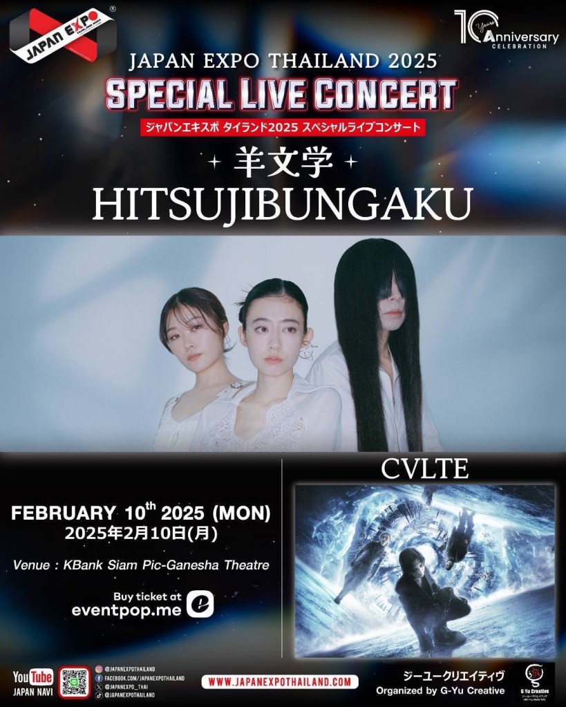 พบกับ “HITSUJIBUNGAKU (ฮิทสึจิบุนกาคุ)” วงดนตรีอัลเทอร์เนทีฟร็อคที่มีเสียงดนตรีที่ทั้งละเอียดอ่อนและทรงพลัง ประกอบด้วย Vo.Gt. โมเอกะ ชิโอซึกะ, Ba. คาไซ ยูริกะ และ Dr. ฮิโระอะ ฟุคุดะ เจ้าของเพลงอนิเมะสุดฮิต และ “CVLTE (คารุโตะ)” วงดนตรีสุดแหวกแนว ภายใต้คอนเซ็ปต์การเดินทางระหว่างความเป็นจริงและโลกเสมือนจริง!! เตรียมสนุกกับ Live!Concert กันเต็มที่! วันจันทร์ที่ 10 กุมภาพันธ์ 2568 เวลา 18:30 น. เป็นต้นไป ณ โรงละครเคแบงก์สยามพิฆเนศ