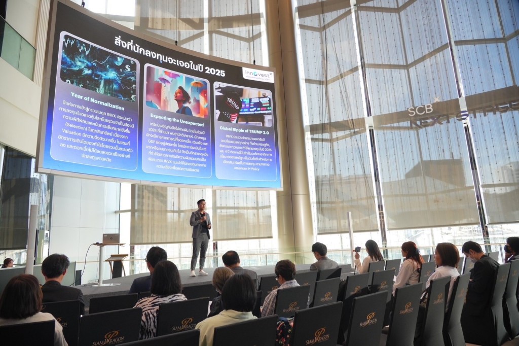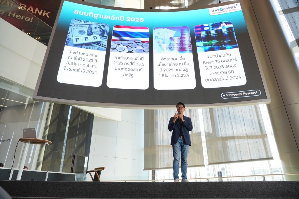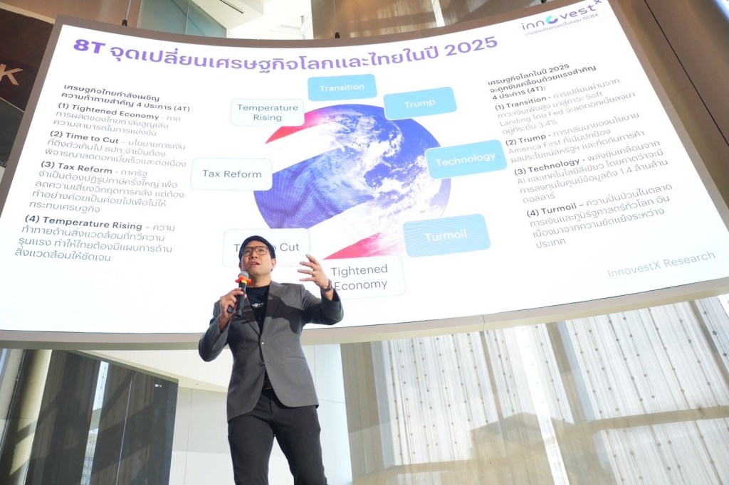 บล. อินโนเวสท์ เอกซ์ เรือธงด้านการลงทุนภายใต้กลุ่มเอสซีบีเอกซ์ (SCBX Group) ประเมินภาพรวมเศรษฐกิจโลกและการลงทุนปี 2568 จะอยู่ในสภาพของ “ความผันผวนสูง ผลตอบแทนต่ำ” กลยุทธ์การลงทุนที่เหมาะคือ “การลงทุนแบบเก็งกำไร (Trading)” เศรษฐกิจโลกจะถูกขับเคลื่อนด้วยแรงสำคัญ 4T ได้แก่ 1. Transition – การเปลี่ยนผ่านจากภาวะเงินเฟ้อสูงมาสู่ภาวะ Soft Landing 2. Trump – การกลับมาของนโยบาย America First 3. Technology – พลังขับเคลื่อนจาก AI และเทคโนโลยีสีเขียว และ 4. Turmoil – ความปั่นป่วนทั่วโลก อันเนื่องมาจากความขัดแย้งระหว่างประเทศ ด้านเศรษฐกิจไทยคาดว่าจะเติบโต 2.7% โดยความท้าทายส่วนใหญ่จะเกิดจากนโยบายของนายโดนัลด์ ทรัมป์ทั้งด้านเศรษฐกิจและต่างประเทศ สินทรัพย์ที่น่าลงทุนคือ ทองคำ ตราสารหนี้คุณภาพดีใน 1H25 ตลาดหุ้นผันผวน เน้นไปที่เชิงรับและหุ้น Value ที่มีการฟื้นตัว แนะนำเลือกลงทุนในตลาดหุ้นสหรัฐฯ จีน อินเดีย และ เวียดนาม ด้านตลาดหุ้นไทยคาดว่ากำไรสุทธิจะเติบโต 22%YoY โดยมองเป้าหมาย SET Index ที่ 1,550 จุด กลุ่มอุตสาหกรรมที่คาดว่าจะให้ผลตอบแทนโดดเด่นจะเป็นกลุ่มมีการสัดส่วนรายได้ภายในประเทศสูงและเป็นกลุ่มเชิงรับ อาทิเช่น กลุ่มอาหารและเครื่องดื่ม และกลุ่มพาณิชย์
