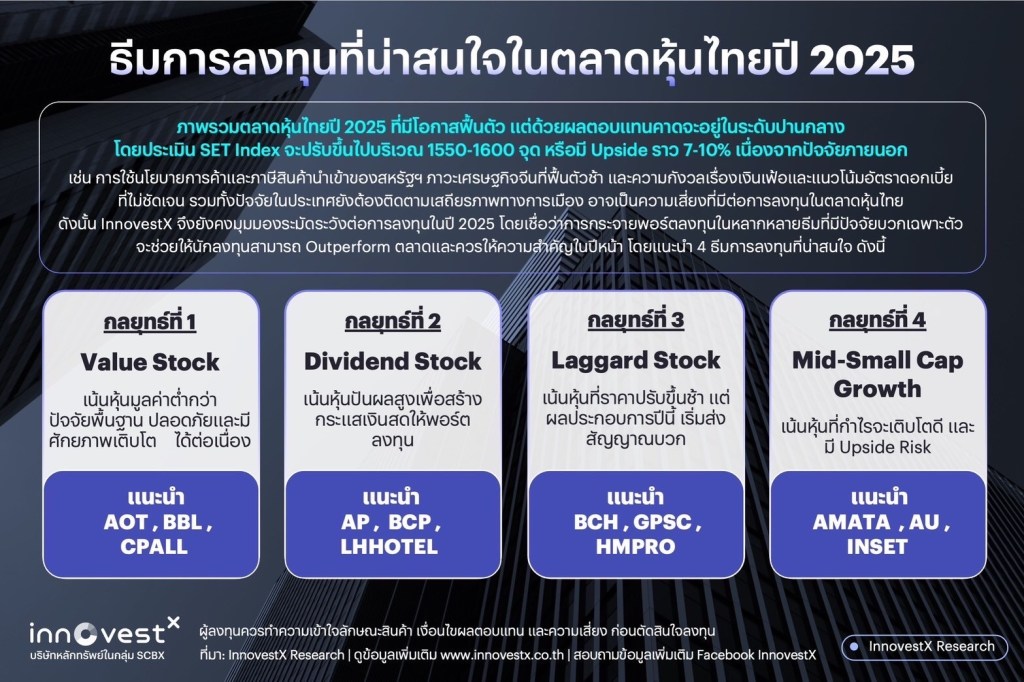 ขณะที่ นายสิทธิชัย ดวงรัตนฉายา นักกลยุทธ์อาวุโสตลาดหุ้นไทยและต่างประเทศ บล. อินโนเวสท์ เอกซ์ จำกัด กล่าวทิ้งท้ายว่า “ภาพรวมและกลยุทธ์การลงทุนครึ่งปีแรกมองว่าเศรษฐกิจสหรัฐฯ ยังมีแนวโน้มดีและแข็งแกร่งกว่าภูมิภาคอื่น แนวโน้มดอกเบี้ยยังเป็นการลดลงตามท่าทีของธนาคารกลางสหรัฐฯ รวมไปถึงมาตรการสนับสนุนเศรษฐกิจภายในประเทศของนายโดนัลด์ ทรัมป์ ซึ่งมีการลดค่าใช้จ่ายและลดภาษีเป็นมาตรการสำคัญ แนะนำ กลุ่มการเงินและหุ้นขนาดเล็กและหุ้นที่ได้ประโยชน์ด้านภาษีที่ลดลง ได้แก่ หุ้น HD, V, COST, WMT ในขณะที่เศรษฐกิจไทยมีแนวโน้มฟื้นตัว โดยการท่องเที่ยว การบริโภคและการลงทุนในช่วงครึ่งปีแรก ยังมีแนวโน้มที่ดี เศรษฐกิจโลกอยู่ในสภาวะที่สมดุล นอกจากนั้นมาตรการกระตุ้นเศรษฐกิจภายในประเทศและการลดดอกเบี้ยจะช่วยลดผลจากการชะลอตัวลงของการส่งออกได้ แนะนำ หุ้นขนาดใหญ่ เน้นตั้งรับในกลุ่มที่มีสัดส่วนภายในประเทศสูงในธีม 1) Value ได้แก่ AOT BBL CPALL 2) Dividend ได้แก่ AP BCP LHHOTEL 3) Laggard ได้แก่ BCH GPSC HMPRO และ 4) Mid-Small cap growth ได้แก่ AMATA AU INSET ”