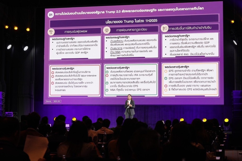 SCB WEALTH นำทีมผู้เชี่ยวชาญด้านการลงทุนที่ครอบคลุมทุกมิติของ SCB WEALTH Holistic จัดงาน SCB WEALTH Holistic Experts ในหัวข้อ “Tomorrow’s Wealth: Key Investment Trends Defining 2025” วิเคราะห์แนวโน้มเศรษฐกิจ และกลยุทธ์การลงทุนปี 2568 พร้อมคัดสรรผลิตภัณฑ์ให้ตอบโจทย์ โดยยึดลูกค้าเป็นศูนย์กลาง สามารถสร้างมูลค่าเพิ่มให้กับสินทรัพย์ได้ในทุกช่วงจังหวะของชีวิต SCB EIC ประเมินเศรษฐกิจโลกขยายตัวชะลอลงจากปีก่อน จากนโยบาย Trump 2.0 ที่กระทบเศรษฐกิจโลกผ่านช่องทางการค้า การลงทุน และการเคลื่อนย้ายแรงงาน คาดปีนี้เฟดลดดอกเบี้ยรวม 50 BPS เพื่อรองรับความเสี่ยงเงินเฟ้อที่อาจเพิ่มขึ้นจากการขึ้นภาษีนำเข้าและการกระตุ้นการลงทุนในประเทศ ด้านเศรษฐกิจไทยโต 2.4% รับผลกระทบการกีดกันการค้าจากสหรัฐ เนื่องจากสินค้าส่งออกไทยเป็นกลุ่มสินค้าที่สหรัฐฯ ตั้งเป้าลดการขาดดุลการค้าและต้องการสนับสนุนห่วงโซ่อุปทานในประเทศทดแทน พร้อมประเมินไทยปรับลดดอกเบี้ย 1 ครั้ง ในช่วงครึ่งแรกของปีอยู่ที่ 2% ส่วน SCB CIO แนะตลาดหุ้นสหรัฐ โดดเด่นสุด ผลตอบแทนมีโอกาสเหนือตลาดหุ้นโลก จากกำไรของบริษัทจดทะเบียนที่มีแนวโน้มเติบโตดี แม้ Valuation แพง แนะลงทุนระยะยาว ในหุ้นกลุ่ม Quality Growth เกาะกระแส AI ด้าน InnovestX แนะลงทุนแบบเก็งกำไร ประเมินเป้าหมายดัชนีหุ้นไทยปีนี้อยู่ที่ 1,550 จุด จากปัจจัยสนับสนุนจากการเติบโตของผลการดำเนินงาน และมาตรการกระตุ้นเศรษฐกิจของรัฐบาล และ Family officeพร้อมให้คำปรึกษาการลงทุนในแต่ละช่วงชีวิต เพื่อความมั่งคั่งทางการเงินในอนาคต