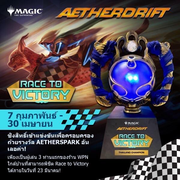 ร้านค้าสมาชิก Wizards Play Network (WPN) ในภูมิภาคเอเชียตะวันออกเฉียงใต้กำลังเร่งเครื่องเพื่อเตรียมพร้อมสำหรับกิจกรรม Race To Victory! ซึ่งจะเกิดขึ้นในระหว่างวันที่ 7 กุมภาพันธ์ ถึง 30 เมษายน การเข้าร่วมกิจกรรมในร้านค้าสมาชิก WPN ที่ร่วมรายการจะให้คะแนนสะสมที่ผู้เล่นสามารถเก็บเพื่อชิงรางวัล การเล่นกิจกรรมอย่างต่อเนื่องในฤดูกาลนี้ จะเปิดโอกาสให้ผู้เล่นสะสมความเร็ว และช่วงชิงรางวัลที่น่าตื่นเต้นมากขึ้นเรื่อยๆ ผู้เล่นสามารถหาร้านค้า WPN และตรวจสอบกิจกรรมได้ ที่นี่