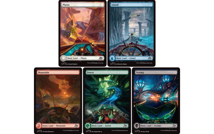 ในยามที่คุณซิ่งผ่านโลกต่างๆ คุณจะได้โอกาสชมวิวอันน่าตื่นตะลึง การ์ดเหล่านี้มีรูปแบบแตกต่างกันหลายแบบ เช่น Full-Art Panorama (แถวบน) Full-Art Driver’s Seat (ขวาล่าง) และ Borderless Dual Lands (ซ้ายล่าง)