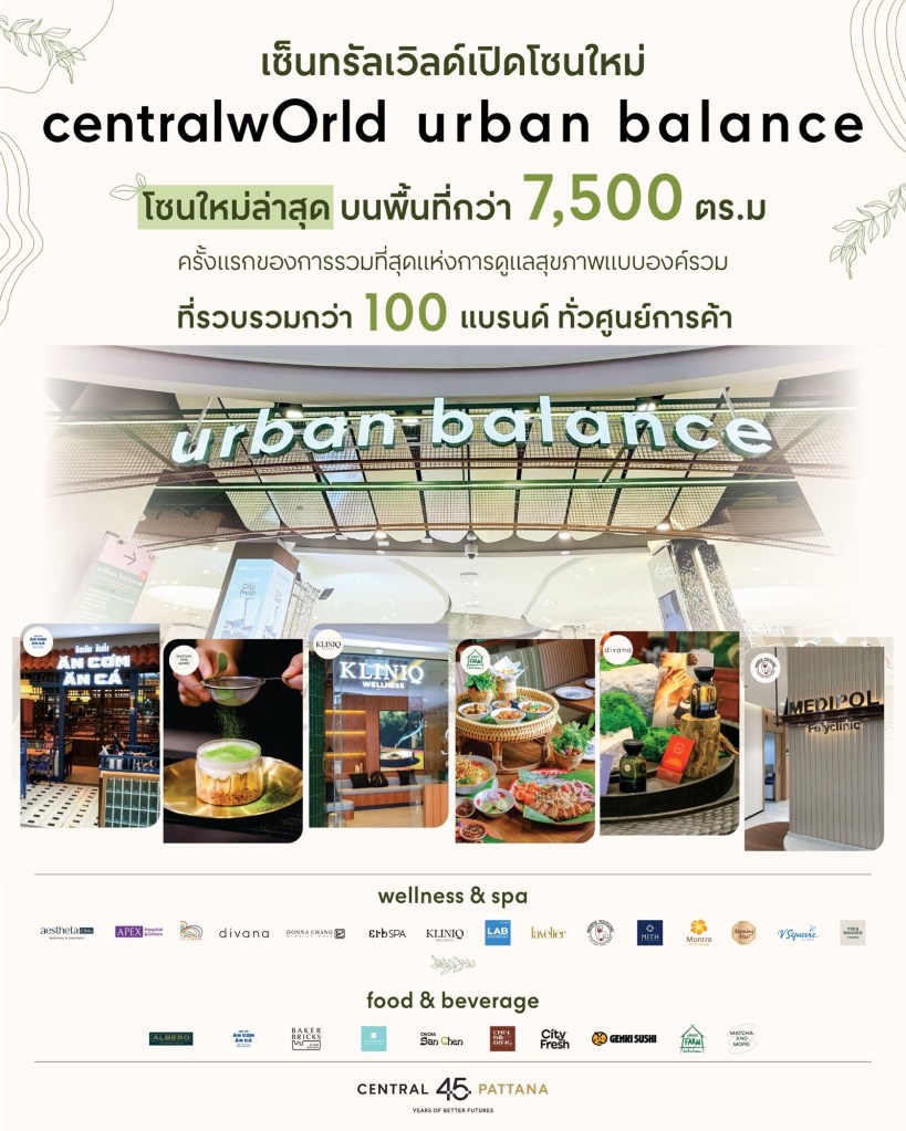 – เซ็นทรัลเวิลด์ ชวนเหล่าคนดังสัมผัสประสบการณ์โซนใหม่ ‘Urban Balance’ ตอบโจทย์ Well-being Lifestyle ครั้งแรกของการเป็นศูนย์รวมแห่งการดูแลสุขภาพแบบองค์รวม ครบทุกมิติทั้ง Anti-Aging, Wellness, Beauty, Food & Fitness ให้คุณบาลานซ์ชีวิตได้ครบจบในที่เดียว