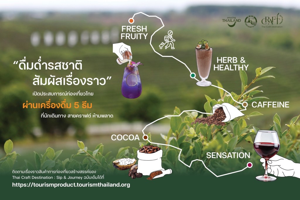การท่องเที่ยวแห่งประเทศไทย (ททท.) สร้างสรรค์โครงการ “Thai Craft Destination: Sip & Journey” มุ่งส่งเสริมการท่องเที่ยวเชิงประสบการณ์ และเป็นมิตรกับสิ่งแวดล้อม โดยเน้นเล่าเรื่องของวัตถุดิบท้องถิ่นและความพิถีพิถันจากผู้ผลิต ภายใต้แนวคิด “ดื่มด่ำรสชาติ สัมผัสเรื่องราว” ผ่านเครื่องดื่ม 5 ธีม ที่นักเดินทางสายคราฟต์ไม่ควรพลาด ได้แก่ Fresh Fruity, Herb & Healthy, Caffeine, Cocoa และ Sensation ที่เปิดโอกาสให้เหล่านักเดินทางได้สัมผัสกับวิถีชีวิต เรื่องราวของชุมชน และรับประสบการณ์ความรู้จากการลงมือปฏิบัติจริง (Hands-on Experience)
