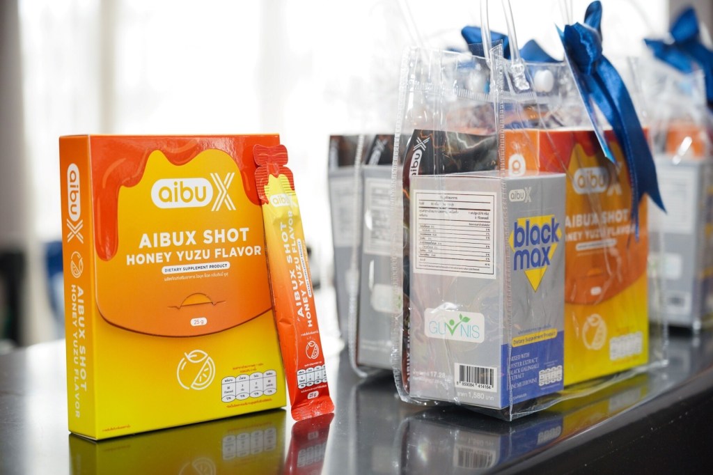 2)“aibuX Shot” (ไอบุค ช็อต) ผลิตภัณฑ์เสริมอาหารรูปแบบช็อตดื่ม ออกแบบมาเพื่อตอบโจทย์ผู้ชายและผู้ใหญ่ยุคใหม่ที่มีไลฟ์สไตล์เร่งรีบ และต้องการบูทแอ็นเนอร์จี้เร่งด่วน ทานก่อนเริ่มกิจกรรม 30 นาที โดยสารสกัดคุณภาพจากธรรมชาติถึง 7 ชนิด ได้แก่ กระชายชายดำเกรดวิจัย, โสมเกาหลี, ถั่งเช่า, หอยนางรม, แอล-อาร์จินีน, ดอกดาเมียน่า และ ซิงค์ เมทไธโอนีน