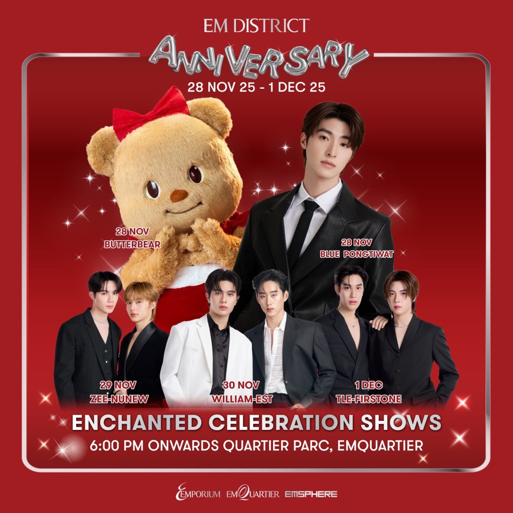 โดยมีไฮไลต์เป็นโชว์สุดเอ็กซ์คลูซีฟ “Enchanted Celebration Show” ครั้งแรกของการพบกันของน้องหมีเนย “BUTTERBEAR x บลู พงศ์ทิวัตถ์” ในโชว์สุดอลังการ เทคนิคแสงสีตระการตาฉลองครบรอบ 2 ปี เอ็ม ดิสทริค และมอบความสุขในช่วงเทศการคริสต์มาส และปีใหม่ พร้อมด้วยศิลปินชั้นนำร่วมโชว์ ได้แก่ เพียว The Voice, น้ำมนต์ ธีรนัยน์ ณ หนองคาย และอาร์ม กรกันต์ ท่ามกลางบรรยากาศแห่งการเฉลิมฉลอง ตอกย้ำการเป็น World Entertainment Hub ของย่านสุขุมวิท ในวันที่ 28 ธันวาคม 2568 เวลา 18.00 น. ณ ควอเทียร์ พาร์ค ชั้น M เอ็มควอเทียร์ พร้อมเฉลิมฉลองต่อเนื่องในวันที่ 29 พฤศจิกายน ถึงวันที่ 1 ธันวาคม ด้วนศิลปินชั้นนำมากมาย ได้แก่ ซี-นุนิว, วิลเลี่ยม -เอส และ เติ้ล-เฟิร์สวัน มอบประสบการณ์พิเศษให้ทุกคน เฉลิมฉลอง EM DISTRICT ANNIVERSARY กันอย่างเต็มอิ่ม