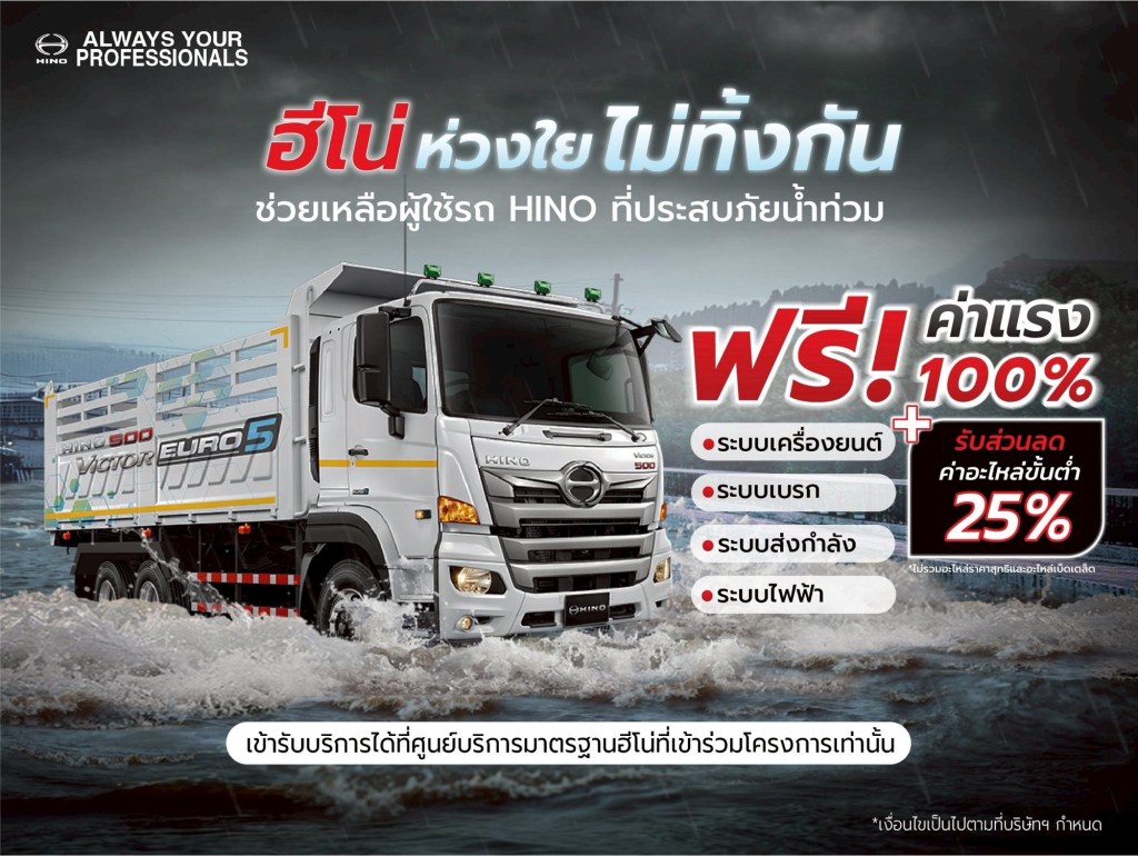 นอกจากการช่วยเหลือชุมชนแล้ว ฮีโน่ยังให้ความสำคัญกับการดูแลผู้ประกอบการและลูกค้าที่ใช้รถบรรทุกที่ได้รับผลกระทบจากน้ำท่วม จึงเดินหน้ามาตรการพิเศษด้านบริการหลังการขายผ่านแคมเปญ “ฮีโน่ ห่วงใย ไม่ทิ้งกัน” บริการตรวจเช็กหลังน้ำท่วม ฟรี! ค่าแรง 100% เพื่อให้รถของลูกค้ากลับมาพร้อมใช้งานได้อย่างรวดเร็วและปลอดภัย ครอบคลุมการตรวจเช็กระบบสำคัญต่างๆ ได้แก่ ระบบเครื่องยนต์ ระบบเบรก ระบบส่งกำลัง และระบบไฟฟ้า พร้อมรับส่วนลดอะไหล่สำหรับอะไหล่ในกลุ่มผลิตภัณฑ์น้ำมันและเคมีภัณฑ์ ชุดติดตั้ง PTO อุปกรณ์ตกแต่ง และแบตเตอรี่ โดยทุกขั้นตอนดำเนินการโดยช่างเทคนิคมืออาชีพจากศูนย์บริการมาตรฐานฮีโน่ เพื่อให้รถกลับมาทำงานได้เต็มประสิทธิภาพและปลอดภัยสูงสุด ลูกค้าสามารถนำรถเข้ารับบริการได้ที่ศูนย์บริการมาตรฐานฮีโน่ทั่วประเทศที่เข้าร่วมโครงการ