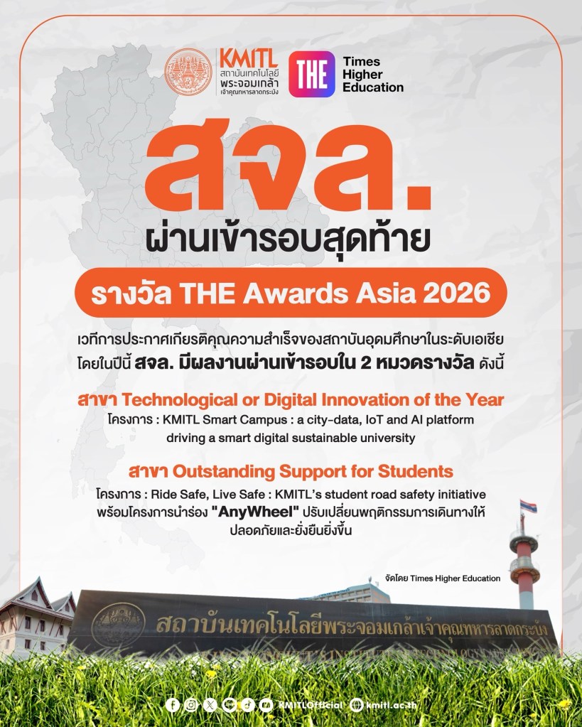สถาบันเทคโนโลยีพระจอมเกล้าเจ้าคุณทหารลาดกระบัง(สจล.) ผ่านเข้ารอบ ในเวที Times Higher Education (THE) Awards 2 โครงการ ควบคู่กับการติดอันดับ Top ของประเทศไทยใน 4 กลุ่มสาขา จาก THE World University Rankings by Subject 2026 สะท้อนความโดดเด่นของมหาวิทยาลัยด้านนวัตกรรม เทคโนโลยีดิจิทัล การสนับสนุนนักศึกษา และคุณภาพทางวิชาการ ตอกย้ำศักยภาพของ สจล. ในการขับเคลื่อนการศึกษา งานวิจัย และการพัฒนาที่ยั่งยืน จนได้รับการยอมรับในเวทีระดับเอเชียและนานาชาติ